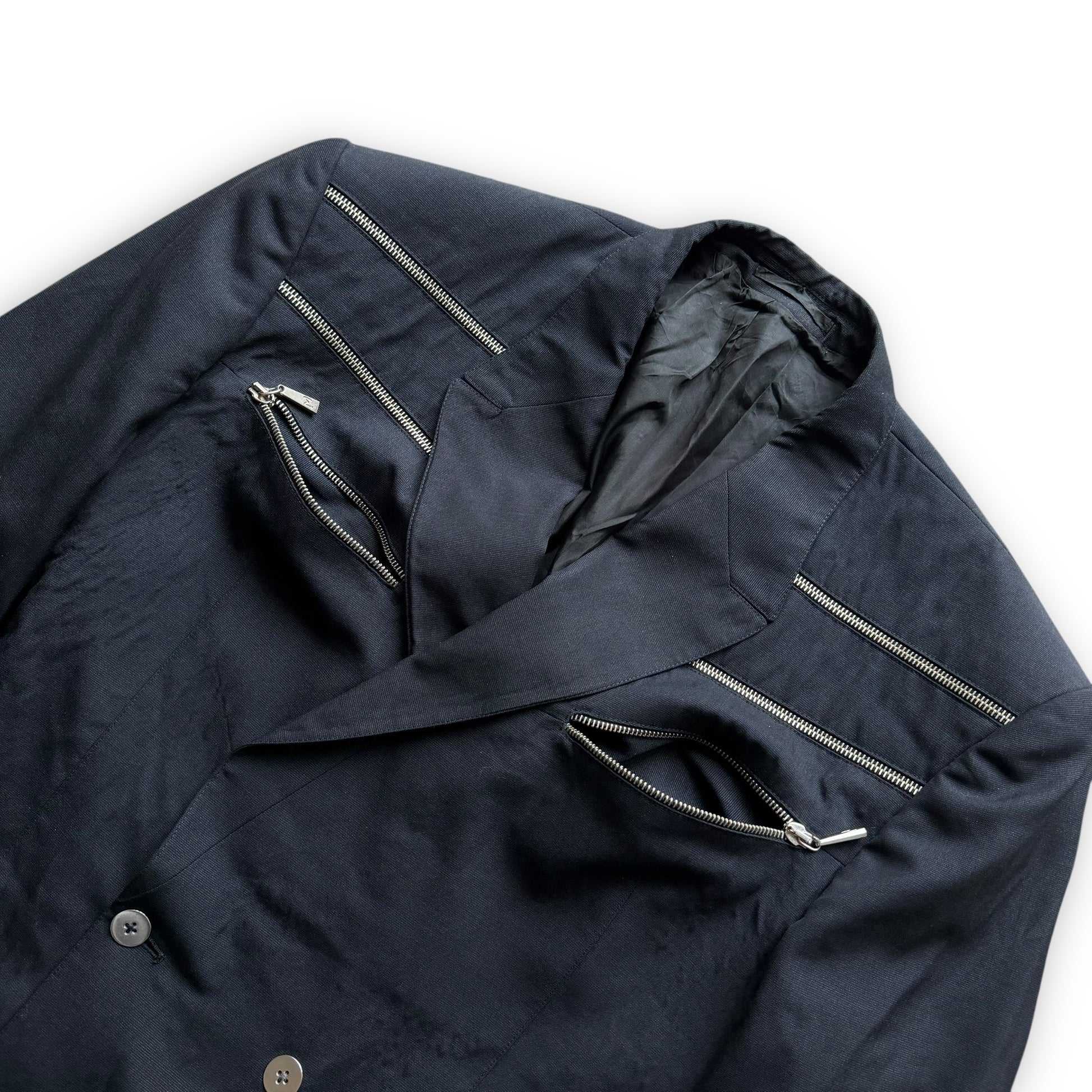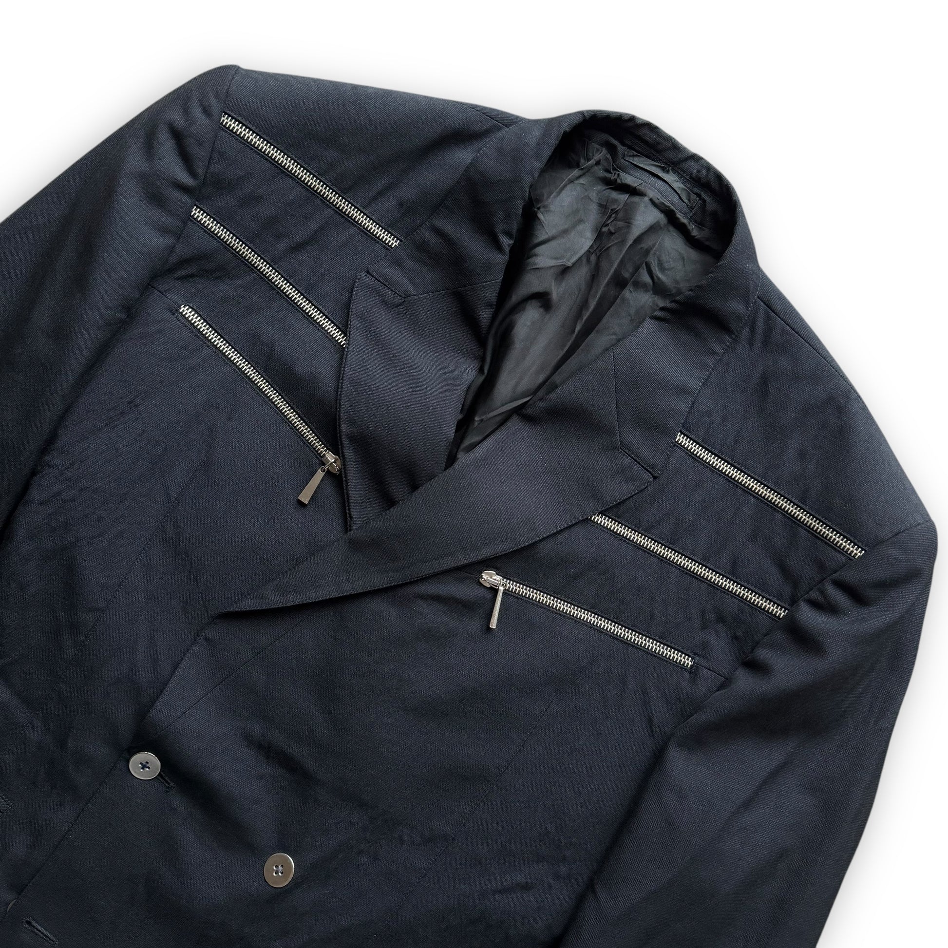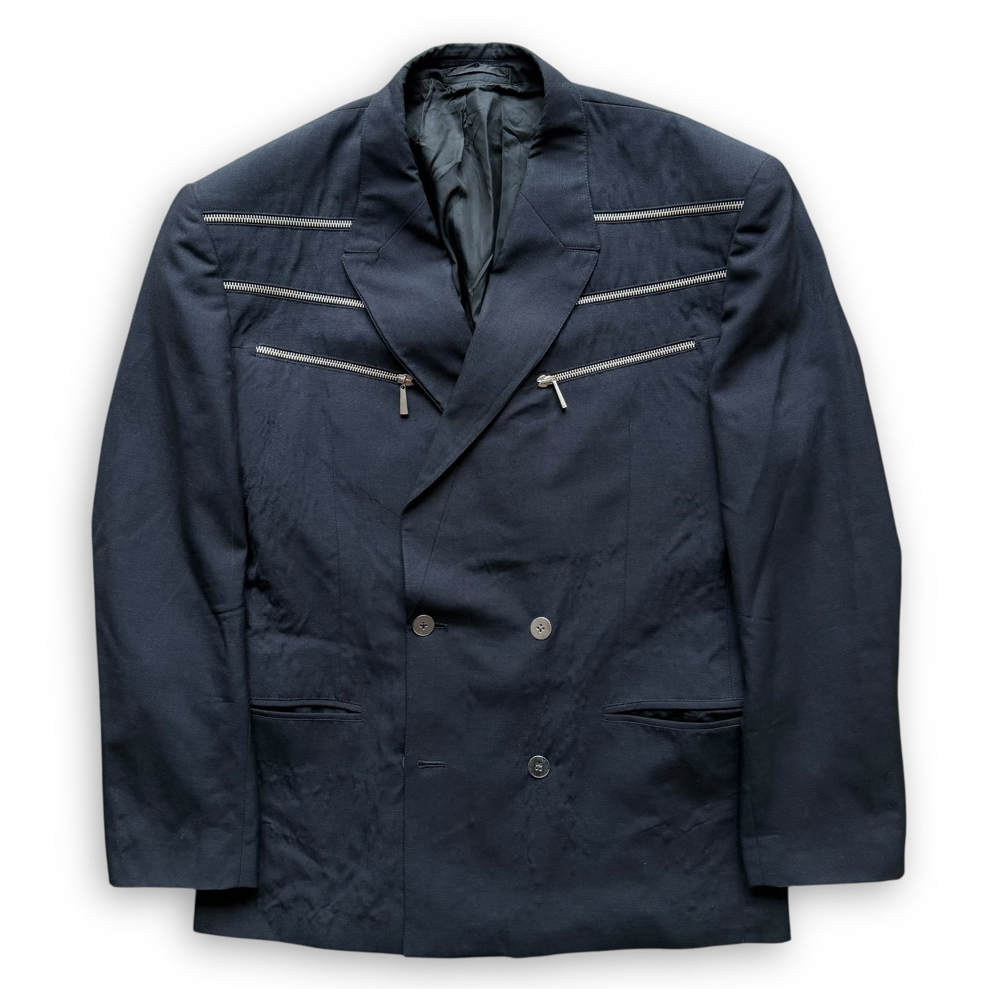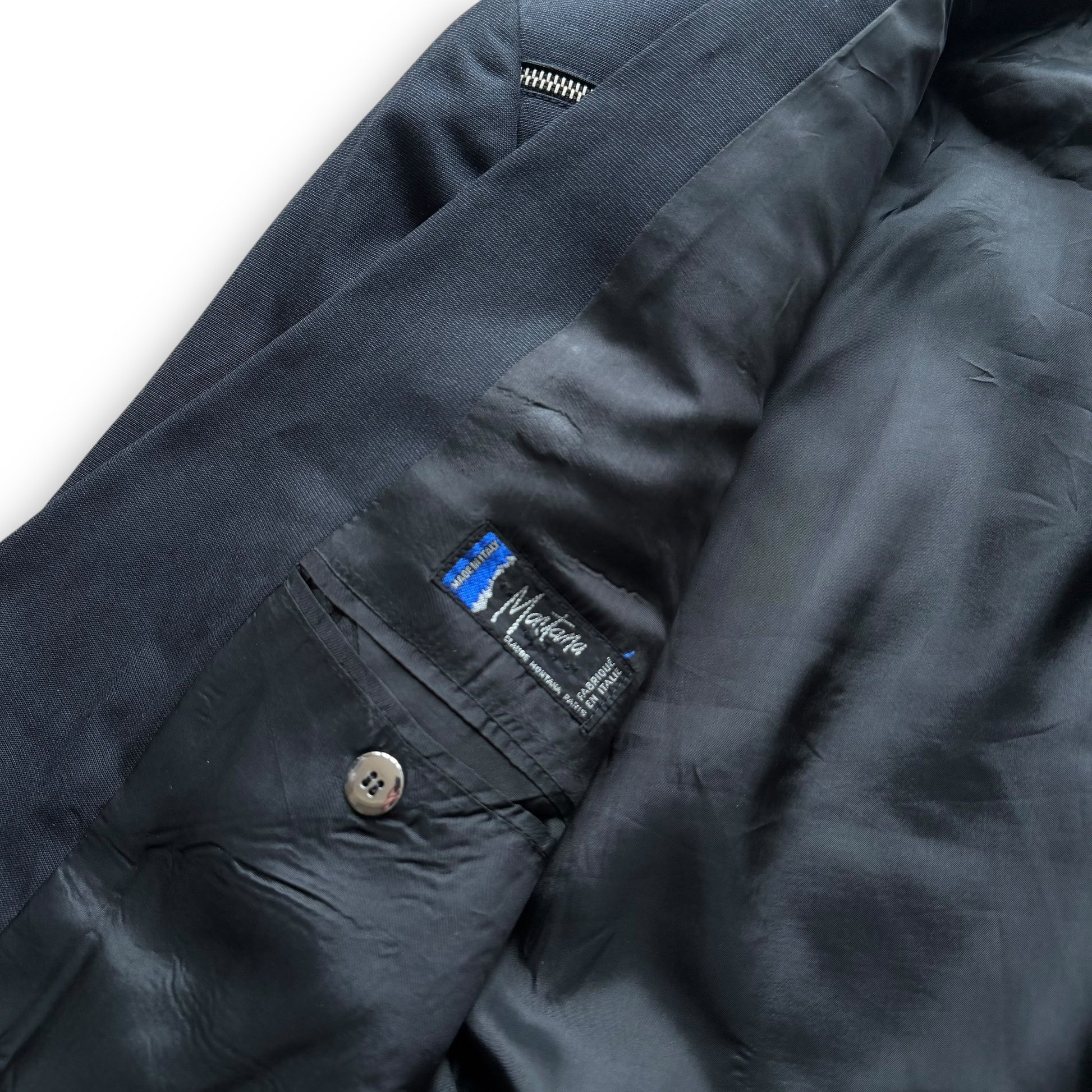 This piece from the 1980s is the perfect example of Claude Montana’s design approach, featuring very strong shoulders and a tailored torso that exaggerates the power suit silhouette. It also features a contemporary twist with zipper detailing on both sides of the shoulders, leading down into 2 zipped chest pockets.