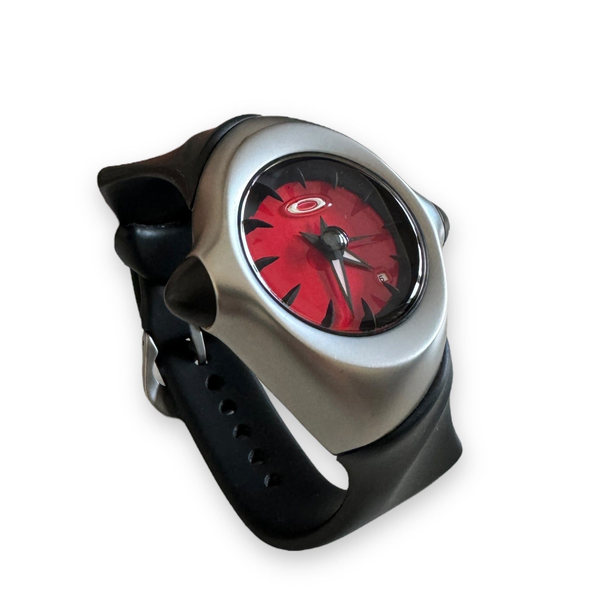 2001 Oakley ‘Crush’ Watch (Silver/Red). Developed from impacting stainless steel with ‘crushing force’ to create the monolithic casing, secured with an unobtainium band for comfort. Features unique structural contours which are believed to take inspiration from the famous Cartier ‘Crash’ watch.