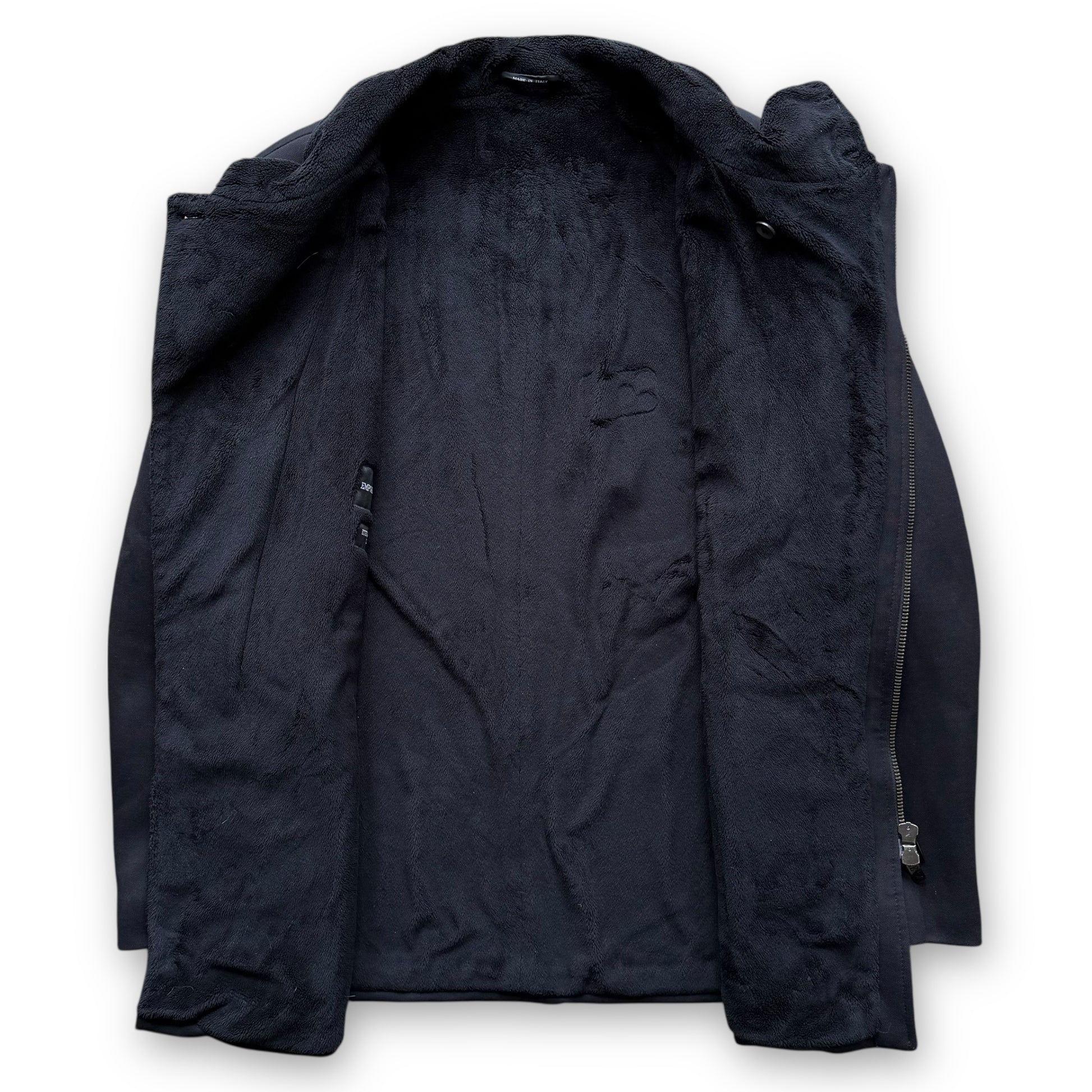 This piece from the 2000s era of the Emporio Armani ‘Meteopolitan’ line features an asymmetrical construction and faux-fur lining.