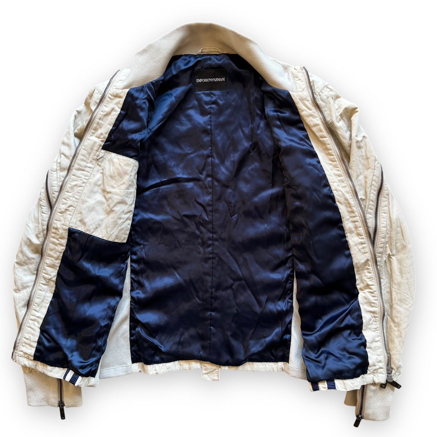 This piece from 2013 features a cream exterior with navy detailing that conceals 2 chest pockets. There are zippers that run along the full length of the arm, allowing the panels to be opened completely. There is a concealed compartment on the silk-like interior lining for storage.
