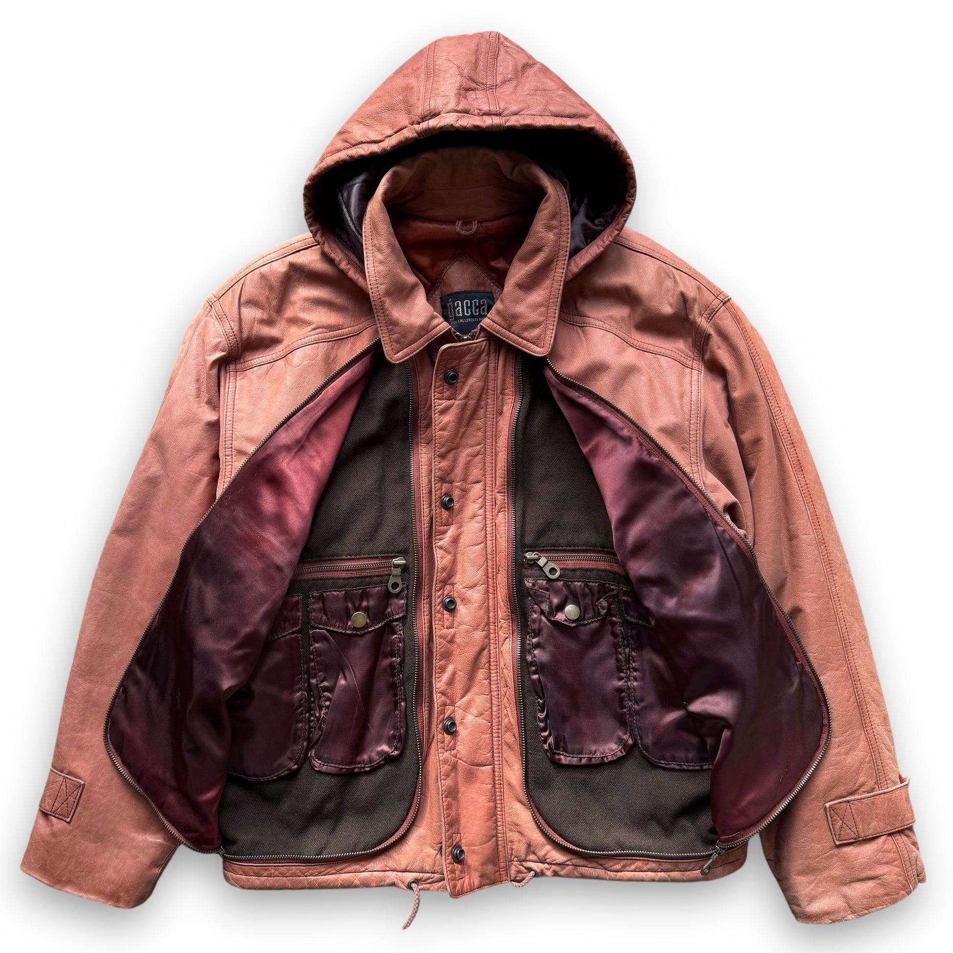This particular piece has a boxy 80s style construction with heavy sun faded leather on the exterior and a quikted lining. It takes inspiration from military parachute flight jackets with the stealth pocket system on both sides concealing cargo pockets and a large compartment. The removable leather hood and rounds off this brilliant piece.