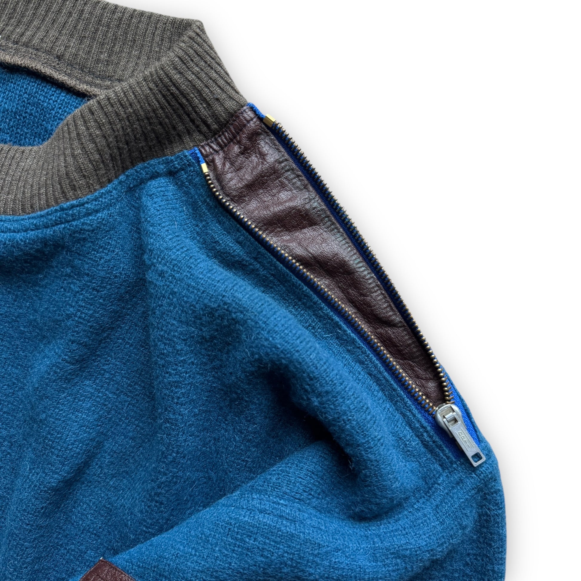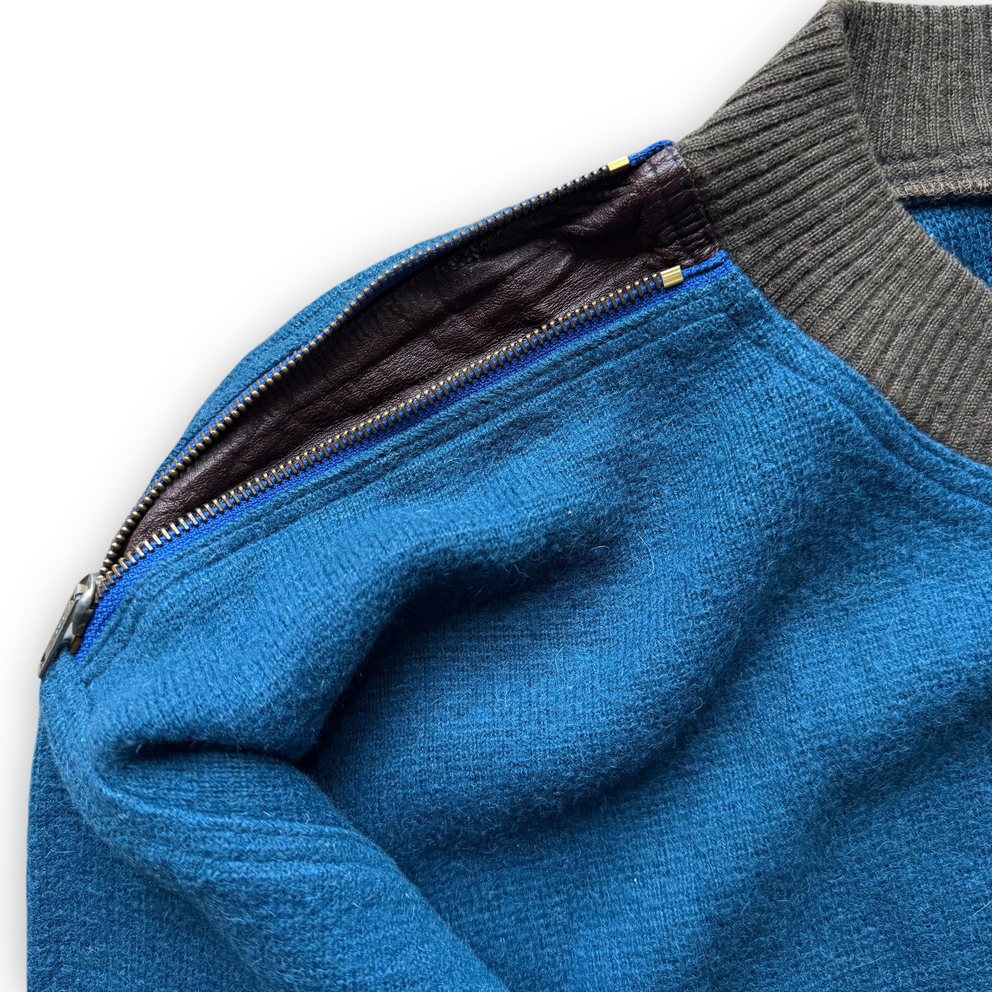 particular piece from the 1980s era features a boxy cut with a wool construction. it also features a leather pocket panel on the left arm and leather-backed expandable zips on the shoulders.