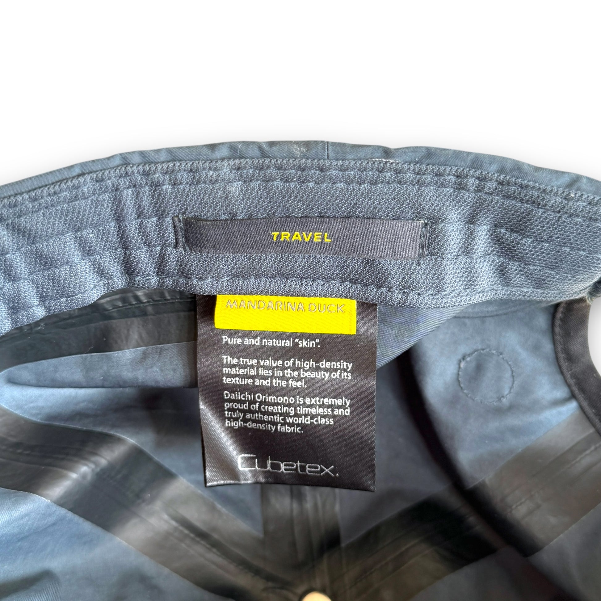 Mandarina Duck is an Italian fashion brand founded in 1977 by Paolo Trento and Pietro Mannato. Originally specializing in leather goods and travel items, the brand became recognized for its bold color choices in a market saturated with classic styles and monochrome products. By the late 90s, Mandarina Duck expanded into the apparel market with the help of British designer Jeff Griffin. The well-considered apparel from that time featured in-house, proprietary fabrics which were developed solely for Mandarina Duck. Unique design elements, branded hardware, and advanced fabrication techniques aligned to create a consistent feeling of luxury, utility, and futurism.