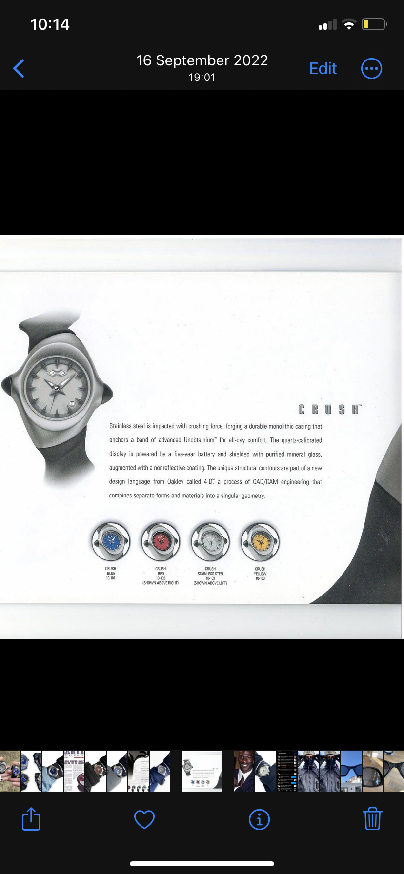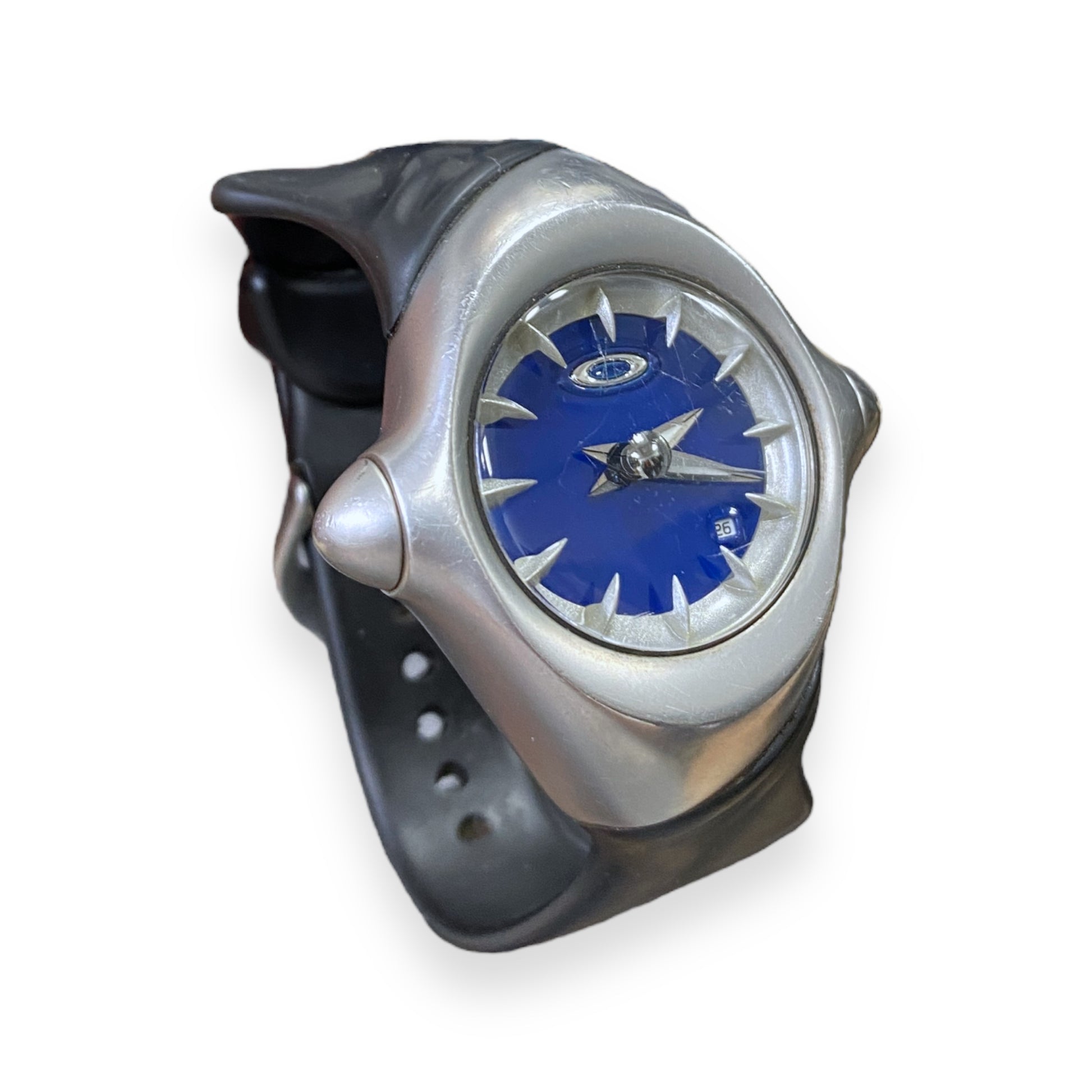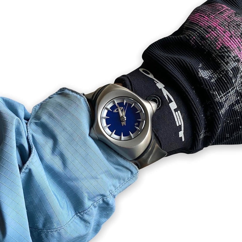 2001 Oakley ‘Crush’ Watch (Silver/Blue). Developed from impacting stainless steel with ‘crushing force’ to create the monolithic casing, secured with an unobtainium band for comfort. Features unique structural contours which are believed to take inspiration from the famous Cartier ‘Crash’ watch.