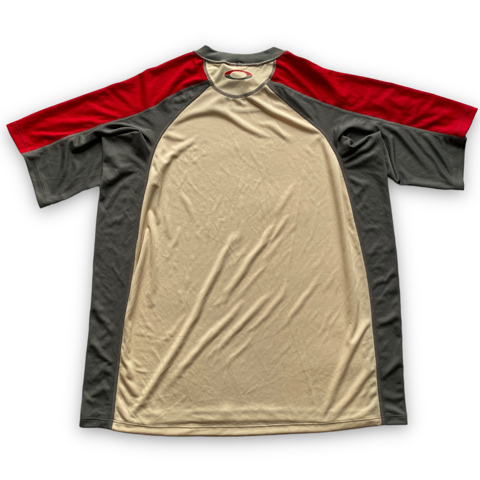 Oakley were known for producing graphic t-shirts with unique designs that reflected the brands ethos during this period. This particular t-shirt from the MTB line has a mesh construction with unique panelling Oakley logos on the front and back.