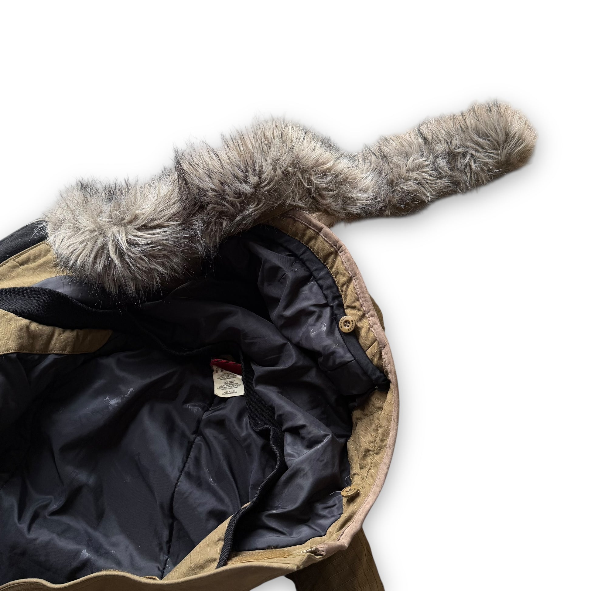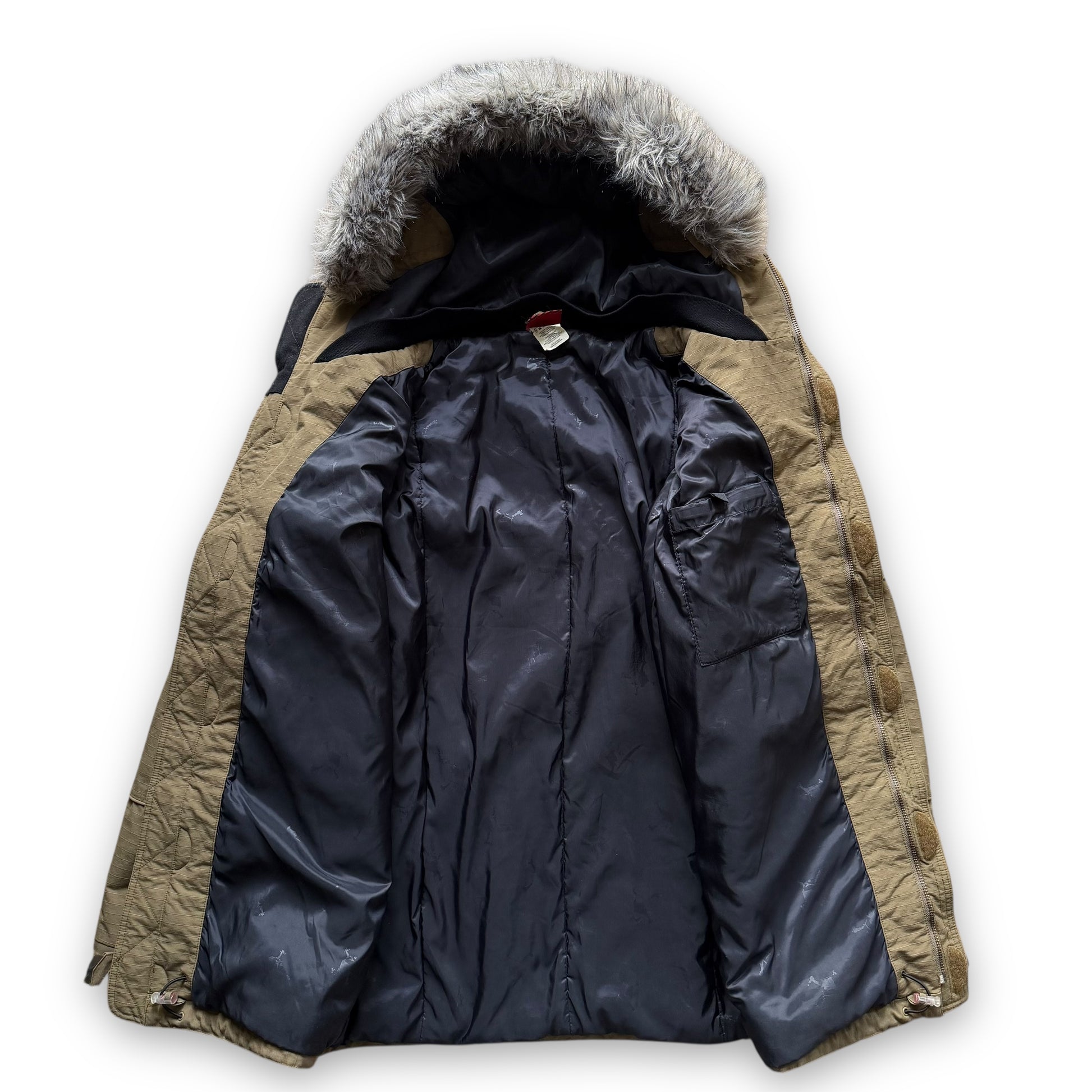 This particular piece from the 2000s features a heavy-duty ripstop exterior with a layer insulation for warmth. There are 2 large pockets and an interior stash pocket. The side panels feature military laser-cutting detailing and the fur around the hood can be removed. There is also a small compartment and attachment loops on the right arm.
