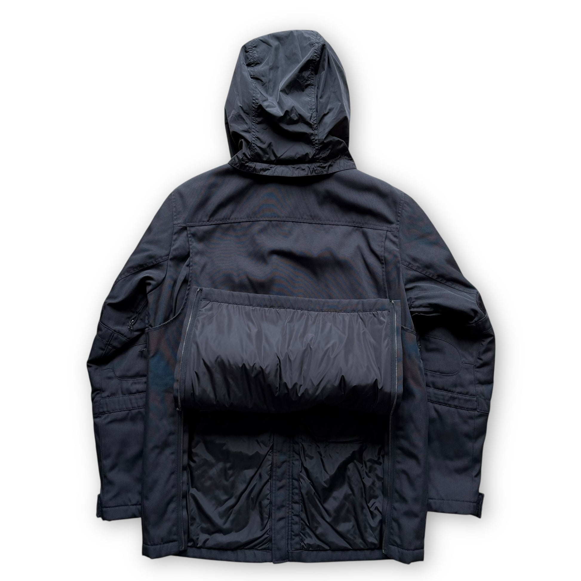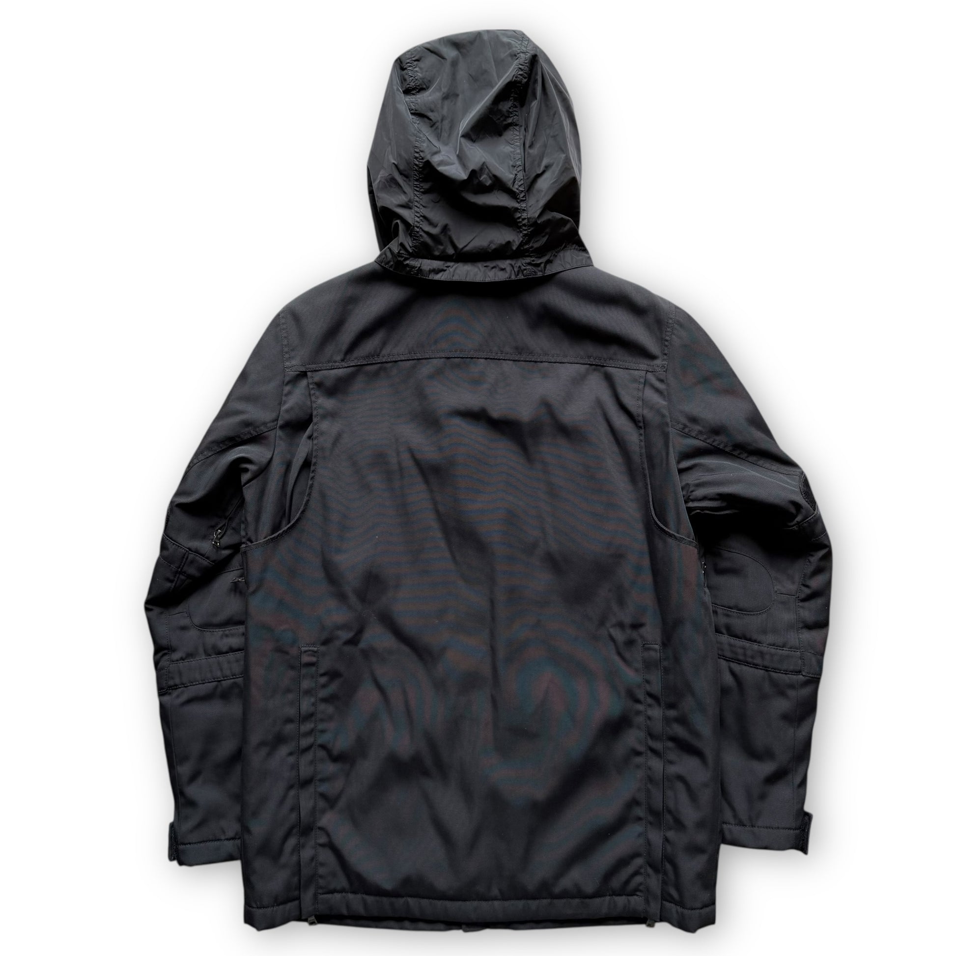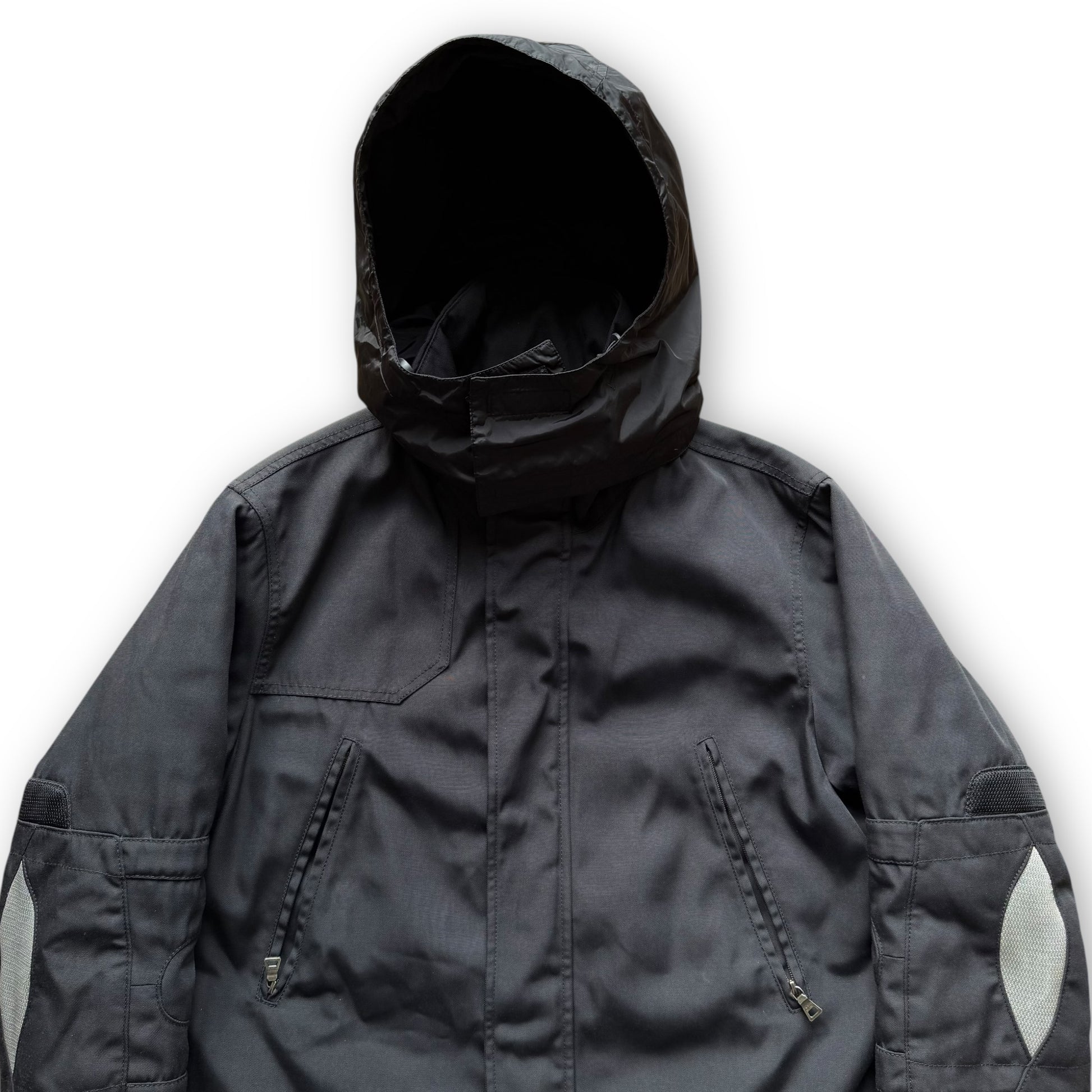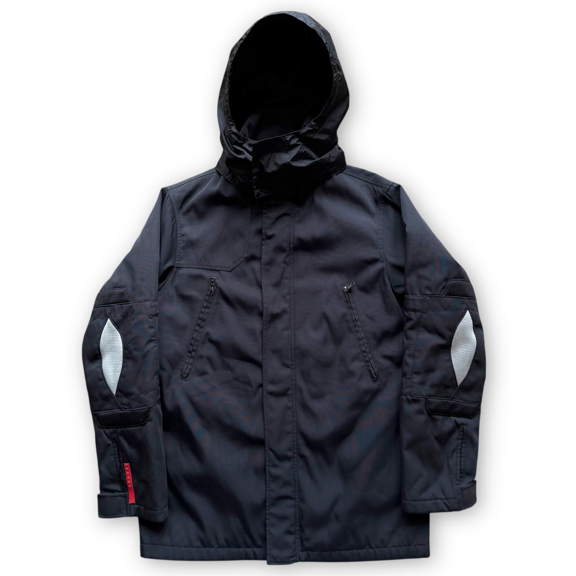 This piece is constructed from a durable ballistic nylon material which has aged and faded beautifully over time, and polyester insulation. It features two fleece-lined hand pockets on the chest, one with a Prada retractable clip attached inside (not working). There are also ventilation zips on the underarms, woven patches on the elbows and RECCO rescue technology. It has adjustable cuffs with nylon lining to keep rain and snow out, an interior pocket and 2 zips at the back that allow the hem to be raised. It’s rounded off with the signature Prada red tab branding by the cuff.