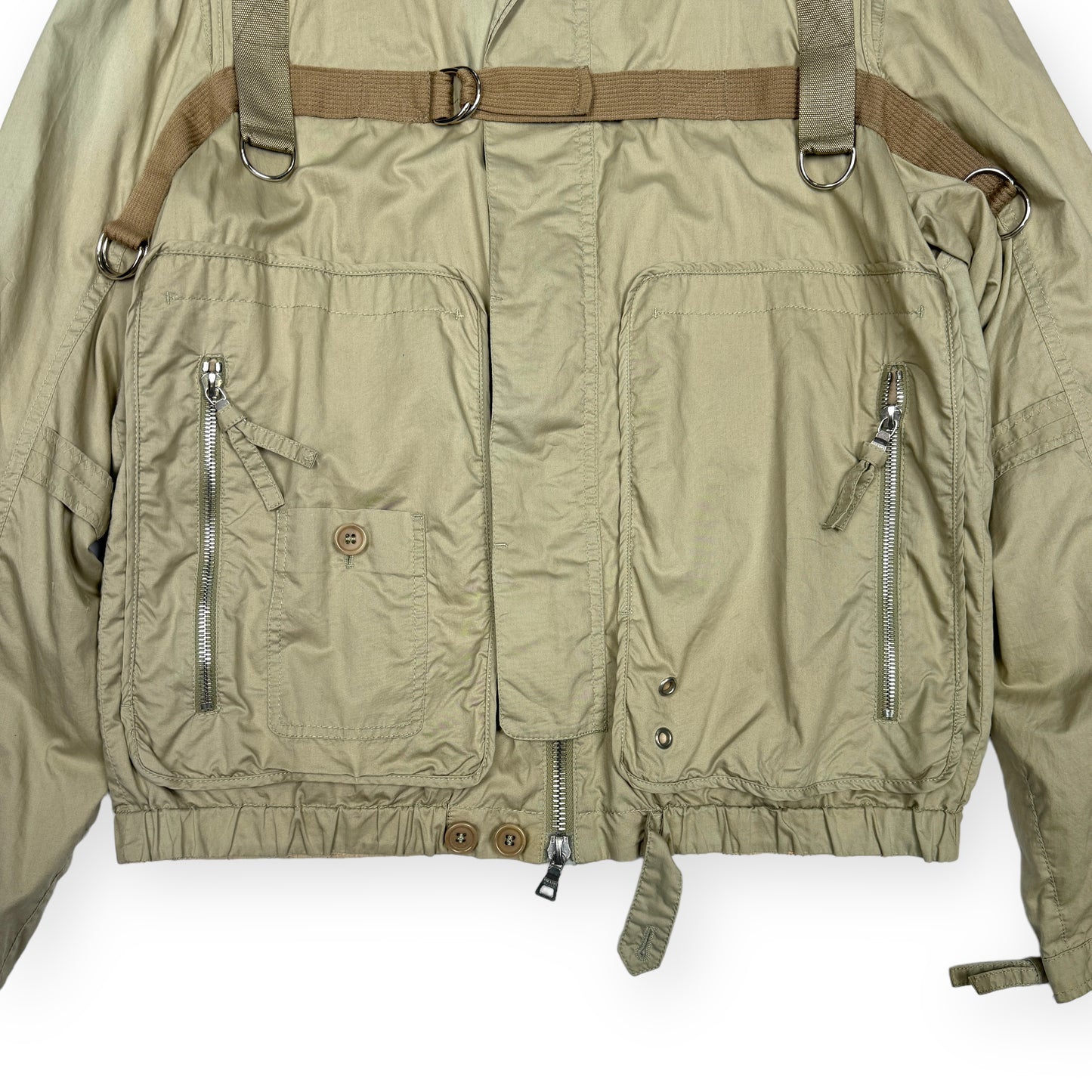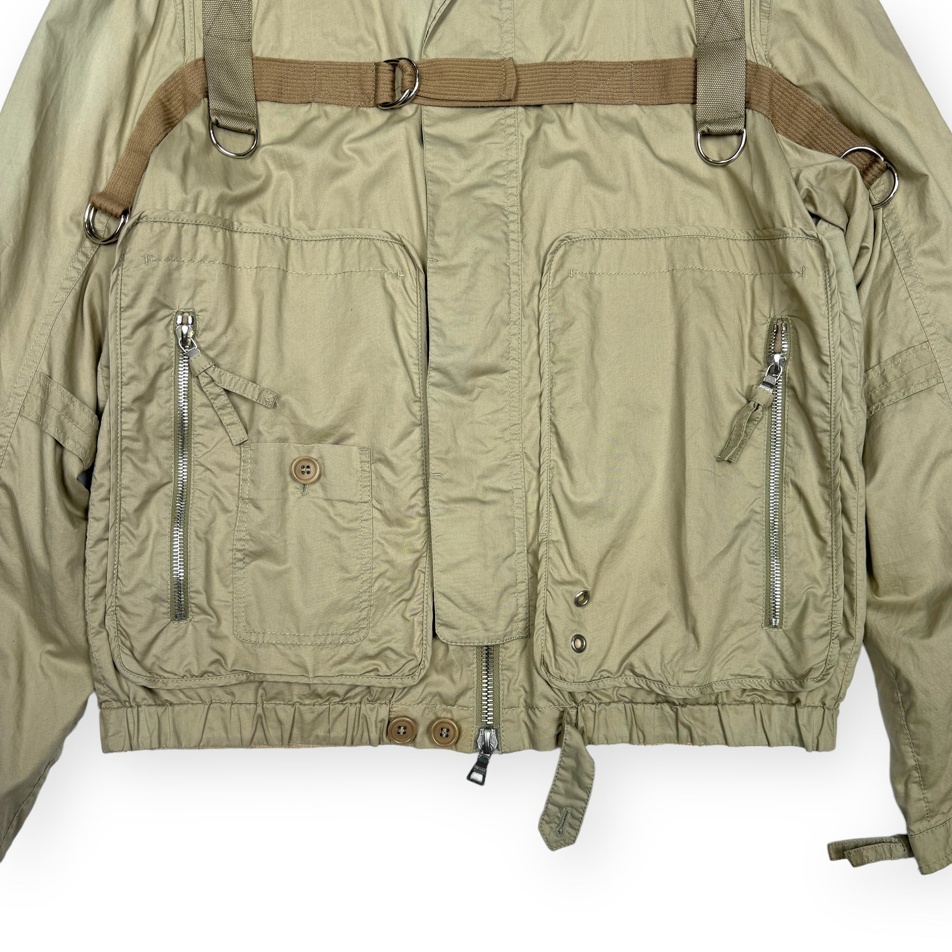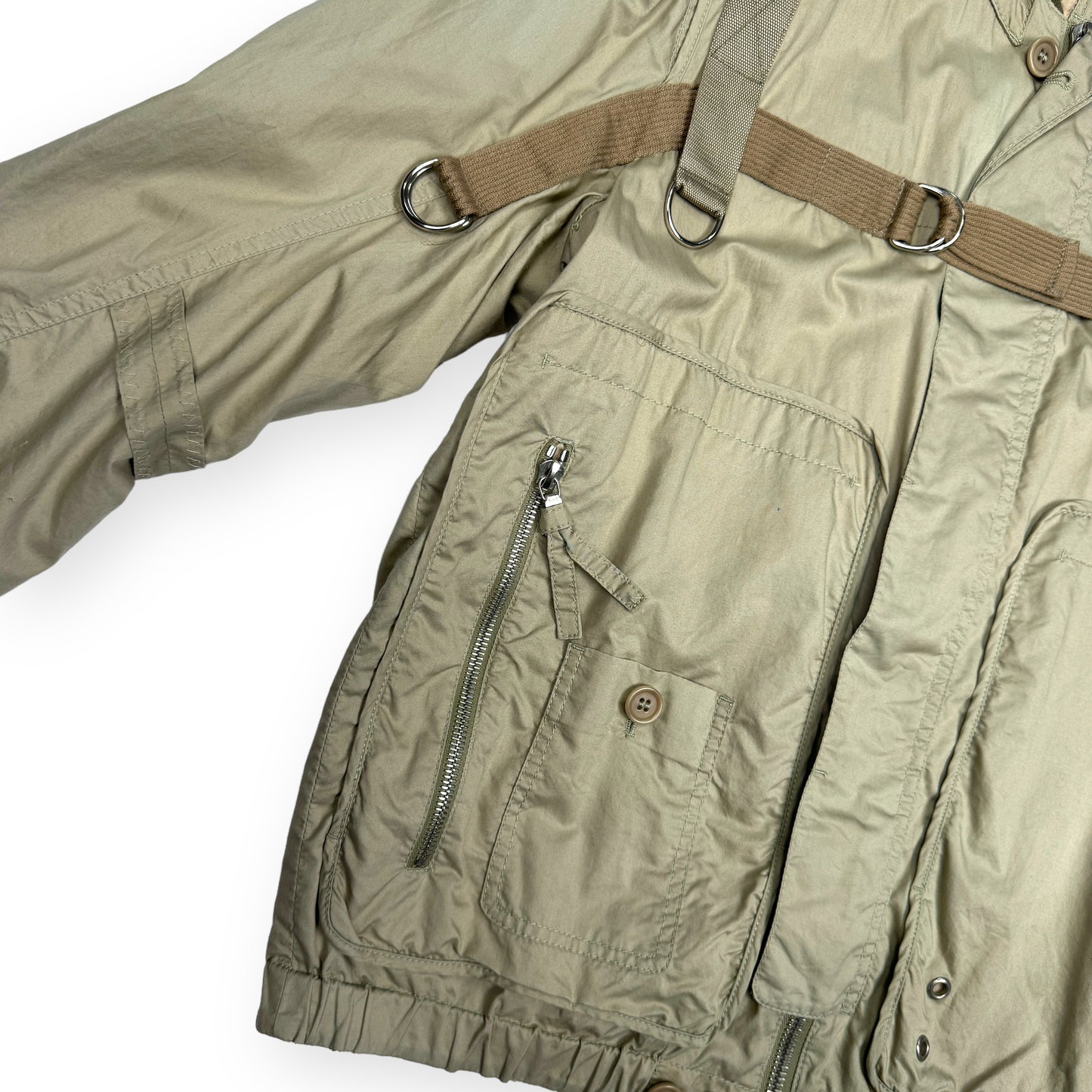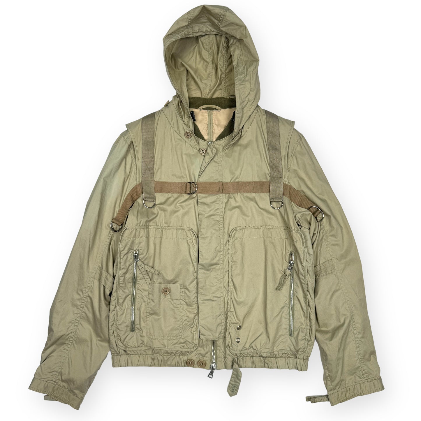 This particular piece represents a more experimental approach that the design team took with the sport line in the mid-2000s, after the success of deconstructed military designs from other fashion houses like D&G at the time. It features standard pockets on the front With multiple bondage straps and d-ring loops. The back panel is disconnected from the main section on the shoulder blades to allow air to pass through to the back. The hood is also removable via the buttons around the collar.