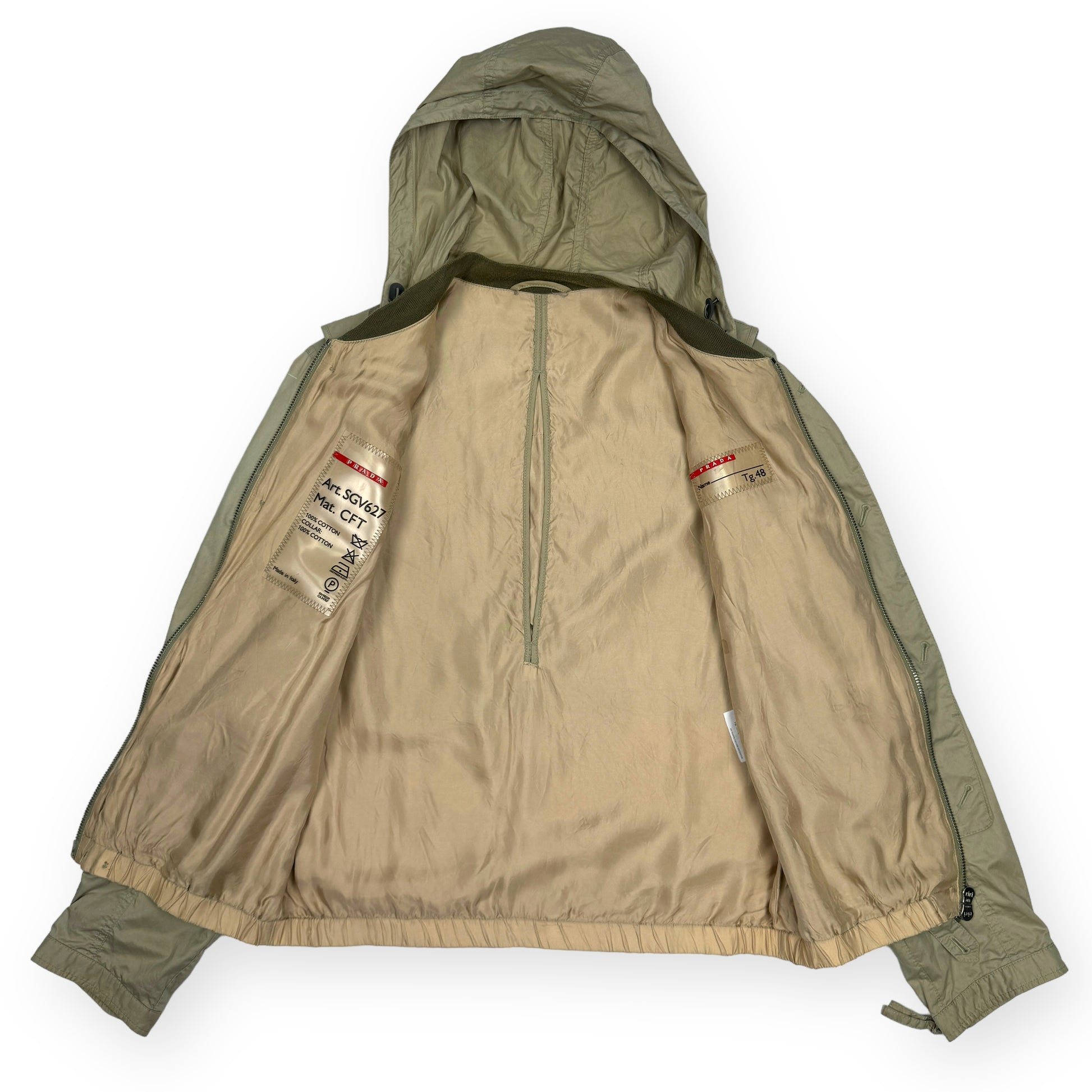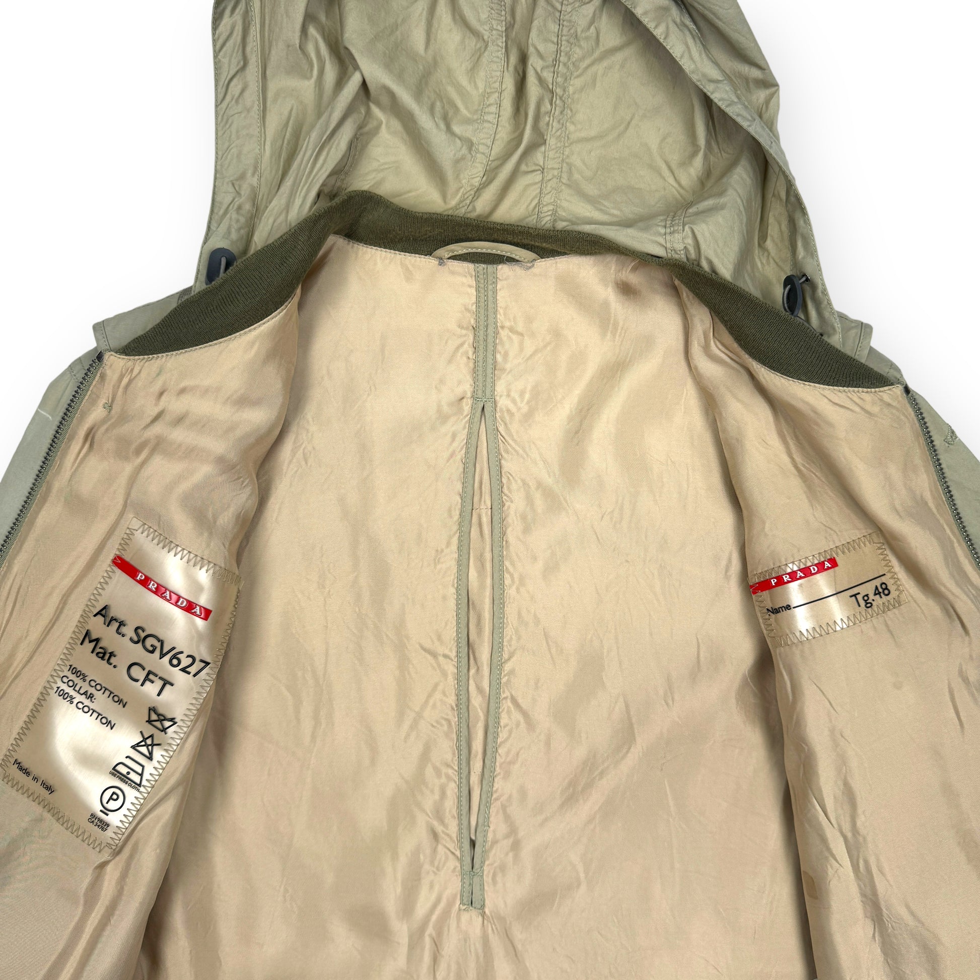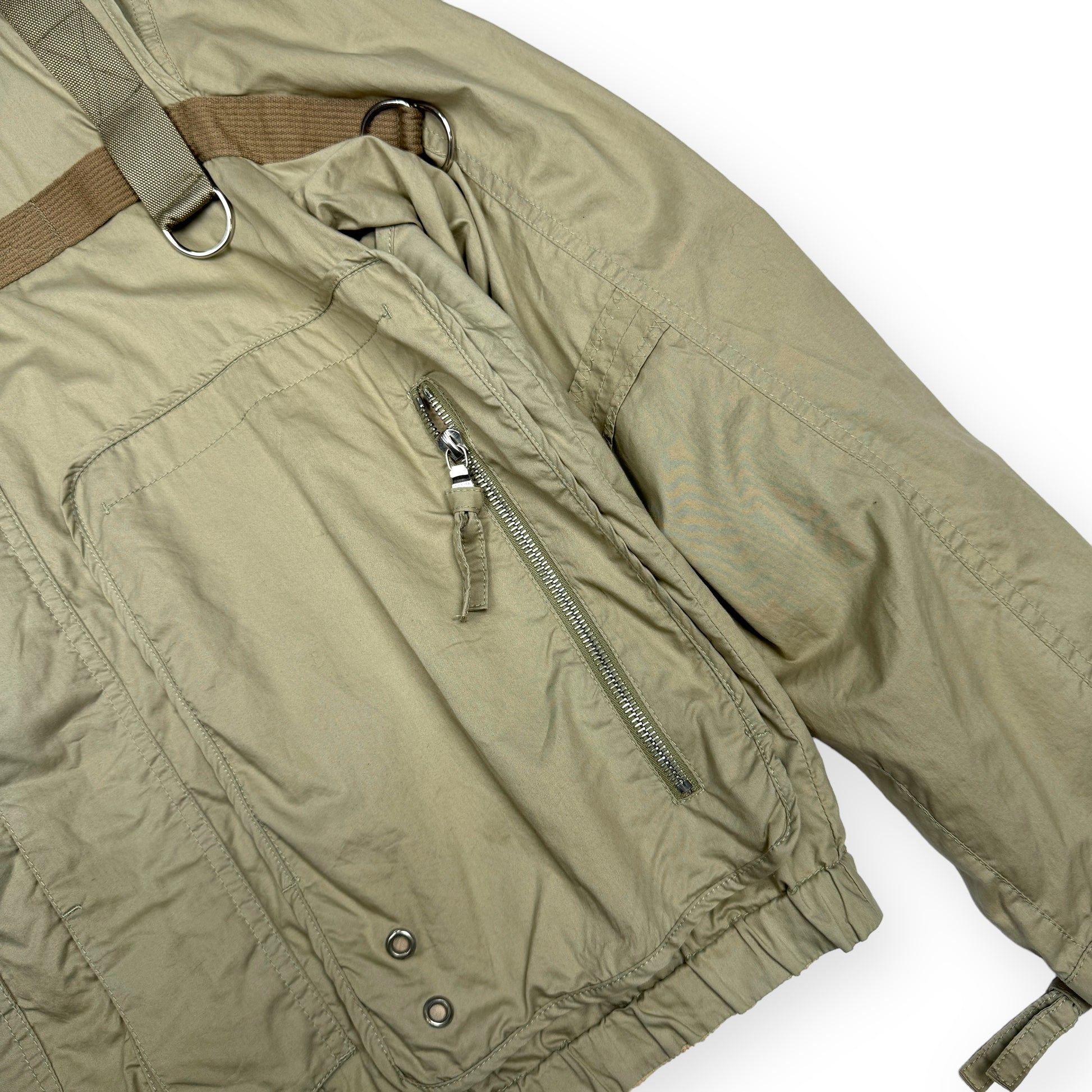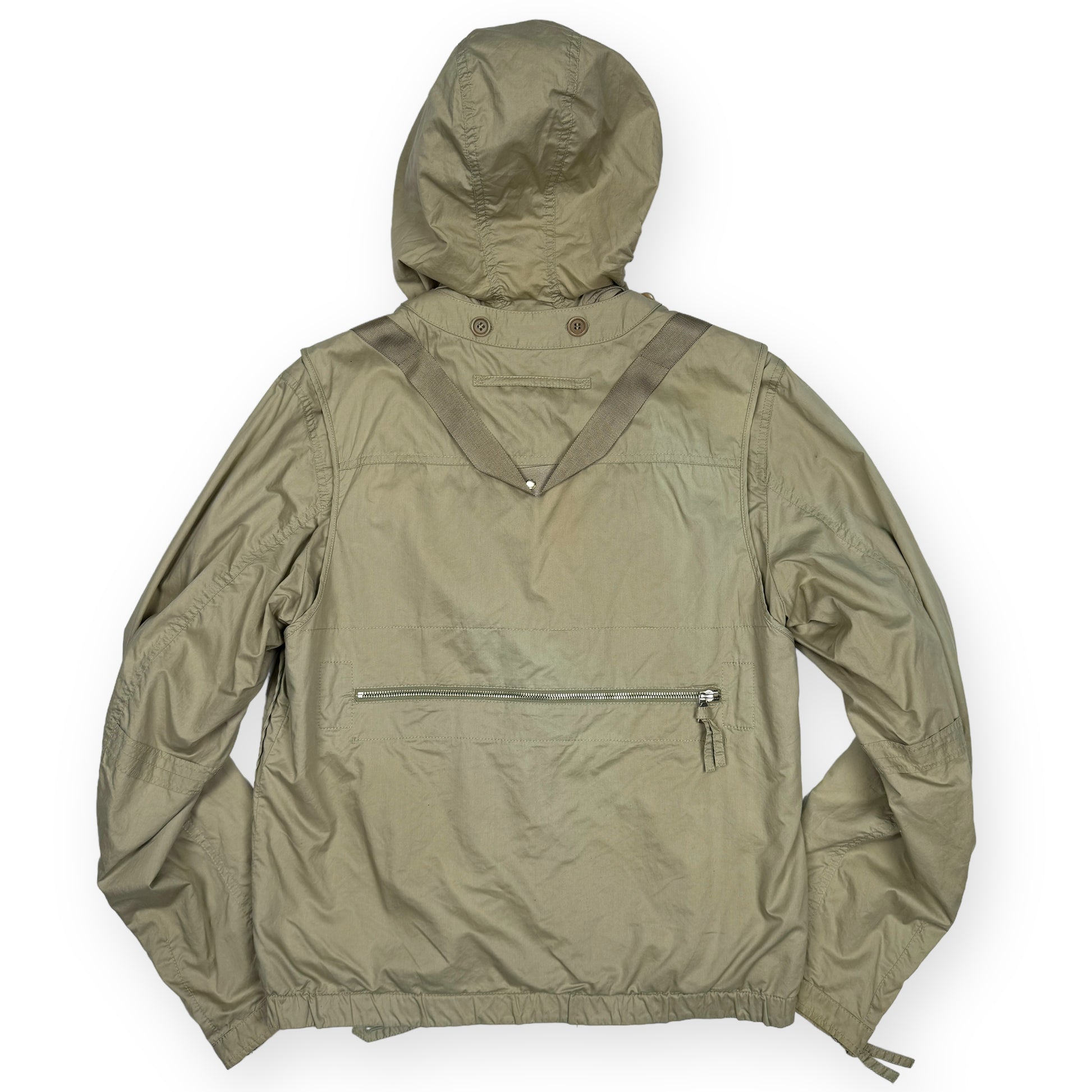 This particular piece represents a more experimental approach that the design team took with the sport line in the mid-2000s, after the success of deconstructed military designs from other fashion houses like D&G at the time. It features standard pockets on the front With multiple bondage straps and d-ring loops. The back panel is disconnected from the main section on the shoulder blades to allow air to pass through to the back. The hood is also removable via the buttons around the collar.