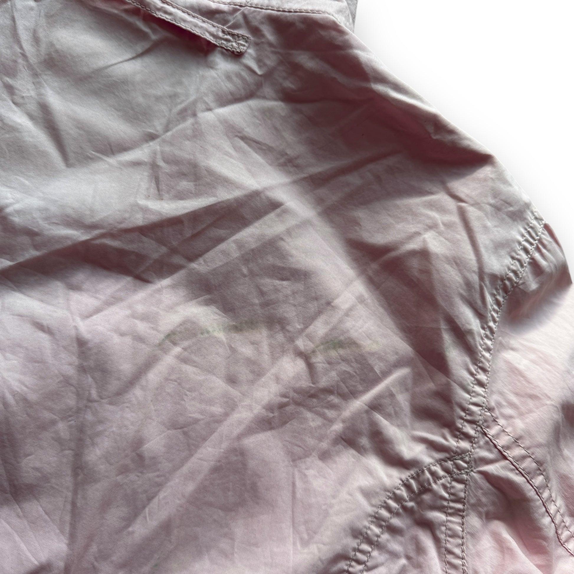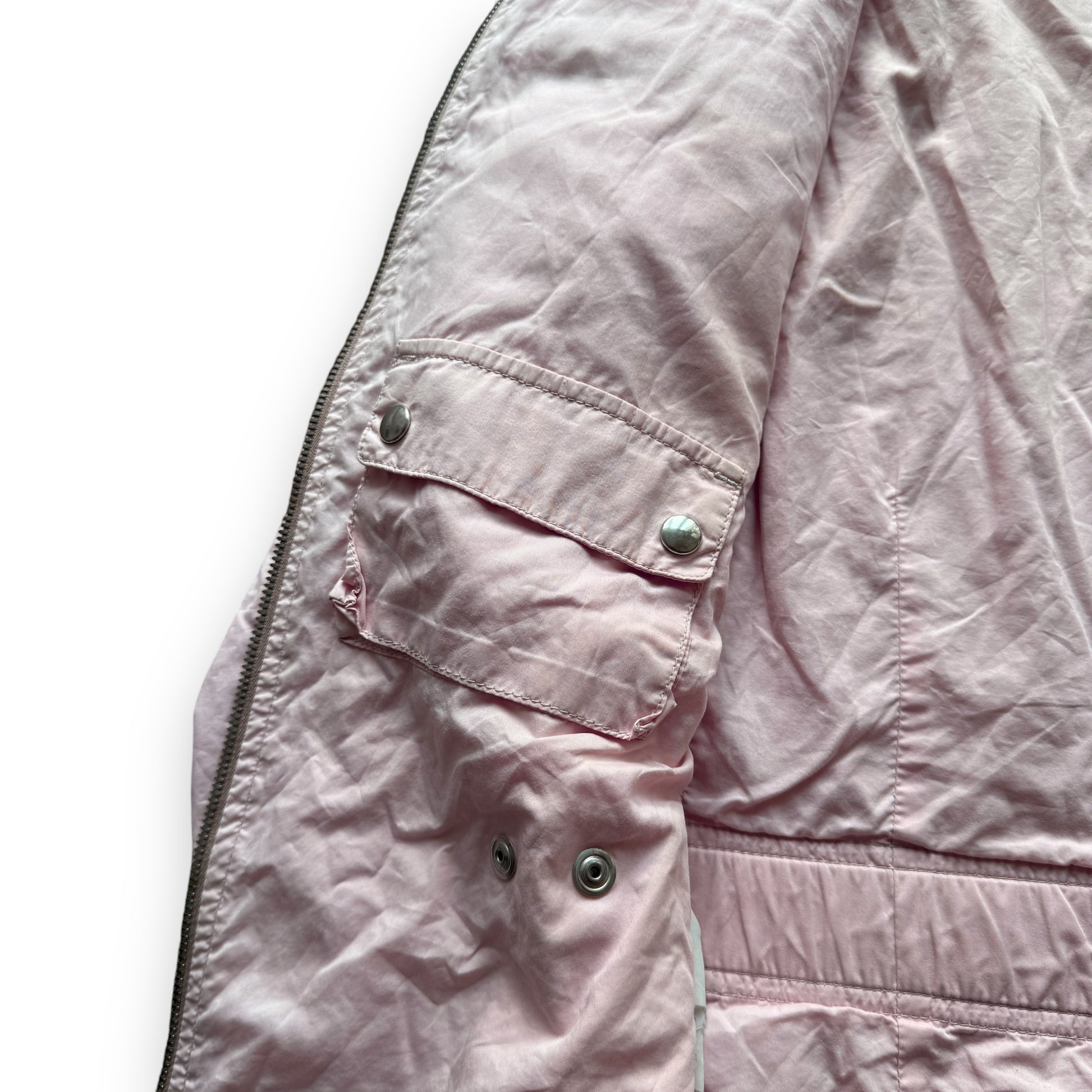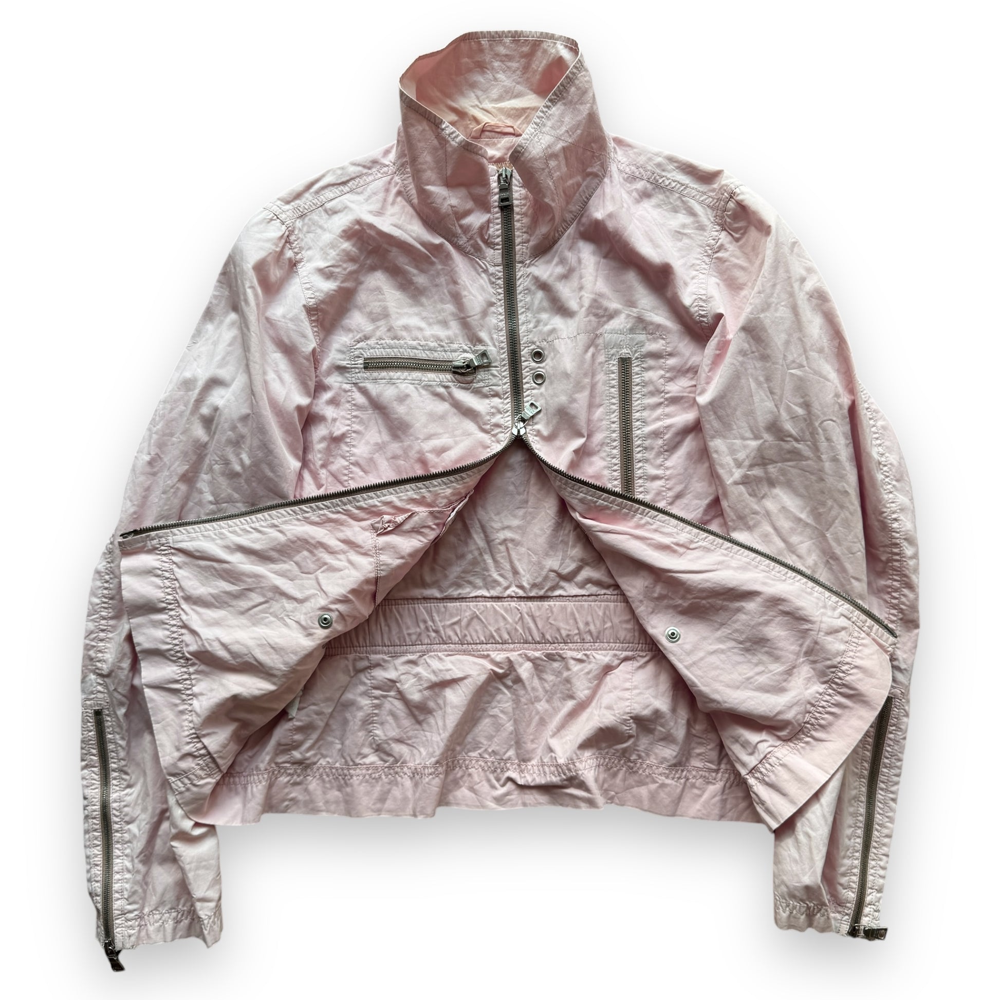 This particular piece is from the early 2000s and features a nylon military style construction with 2 chest pocket styles on the exterior and a cargo pocket on the interior. There is an elasticated belt system that can be secured with buttons to bring the waist in. The mesh-backed cuffs can be zipped open.