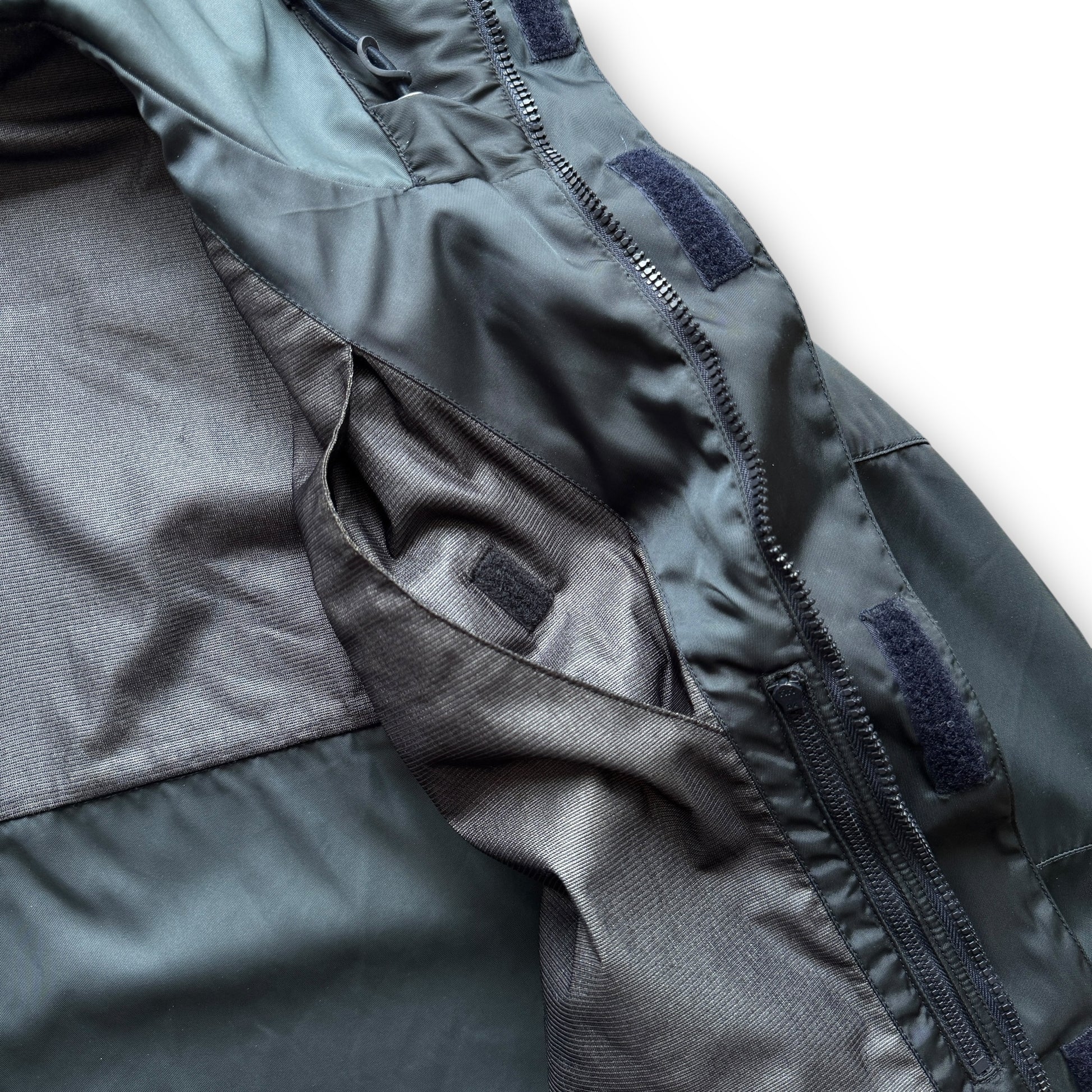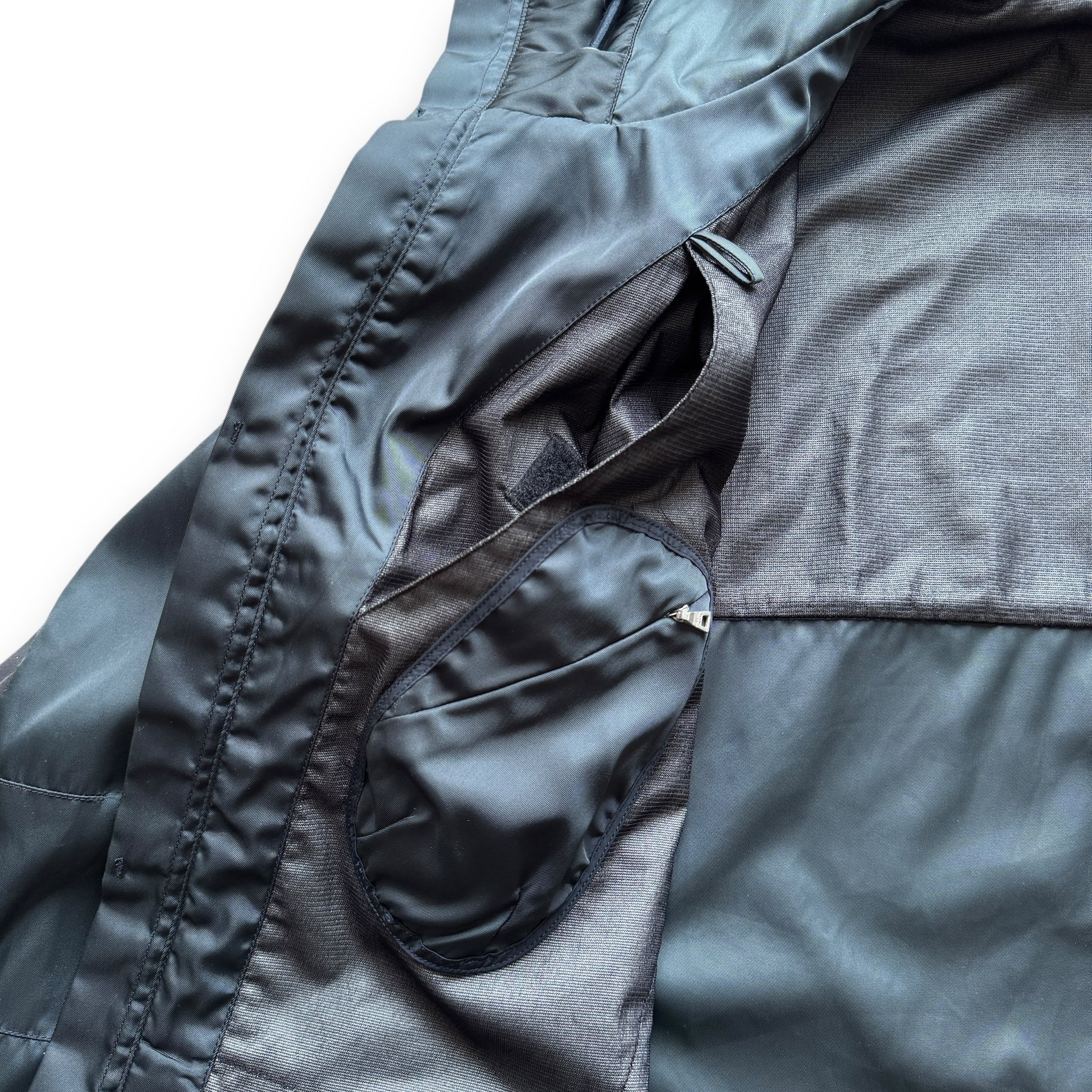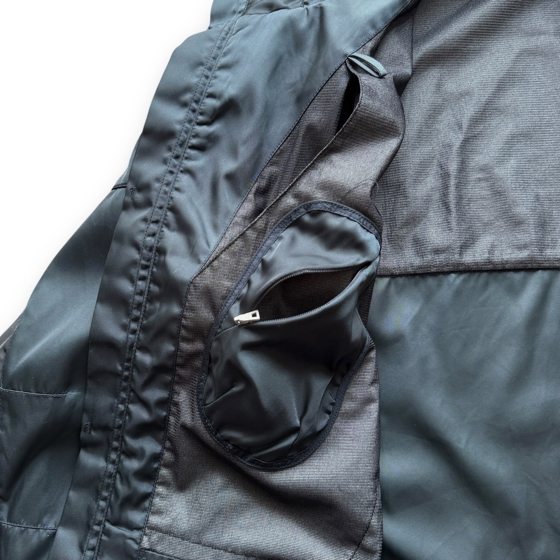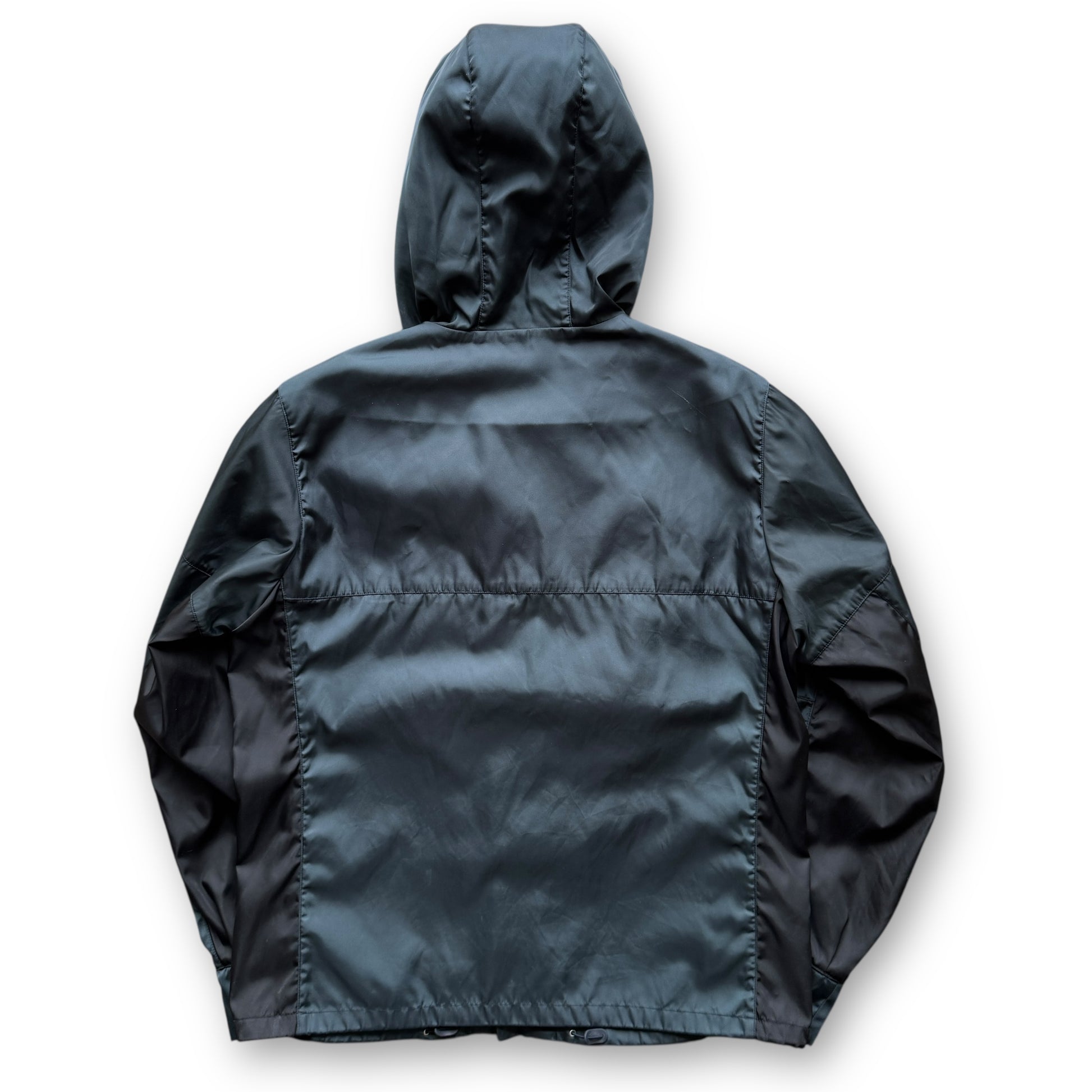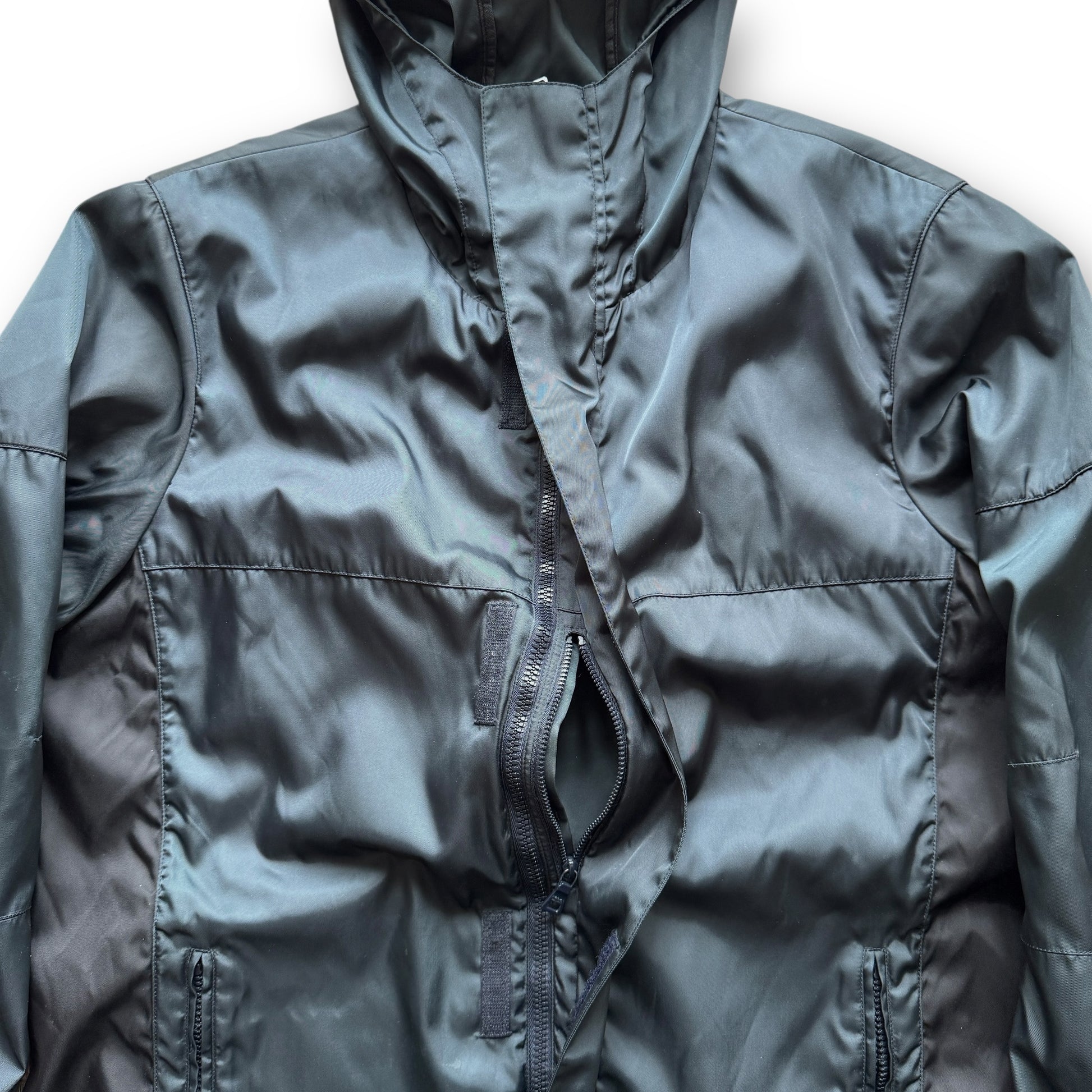 This particular piece from the late 2000s era features a unique two-tone panelled construction with a soft and lightweight waterproof fabric. It has 2 standard pocket, a zipped opening by the main zipper that allows quick access under the jacket and unique interior compartments.