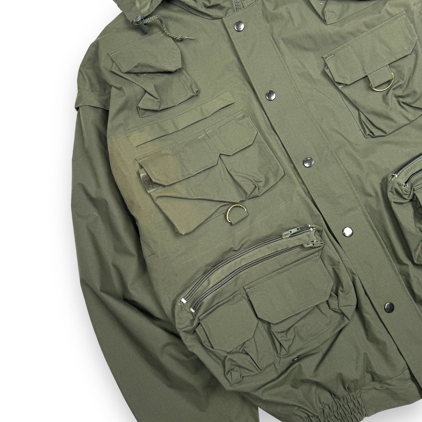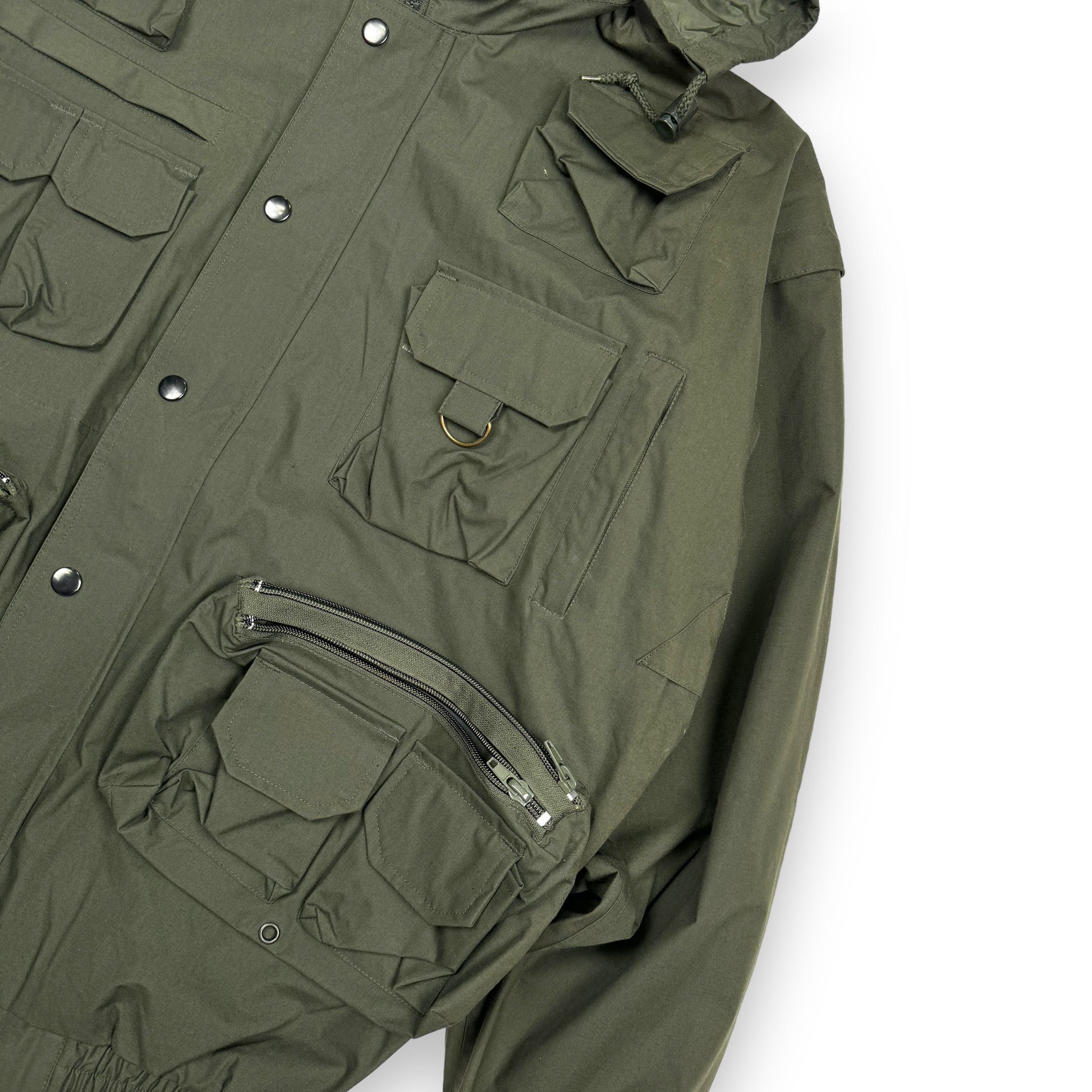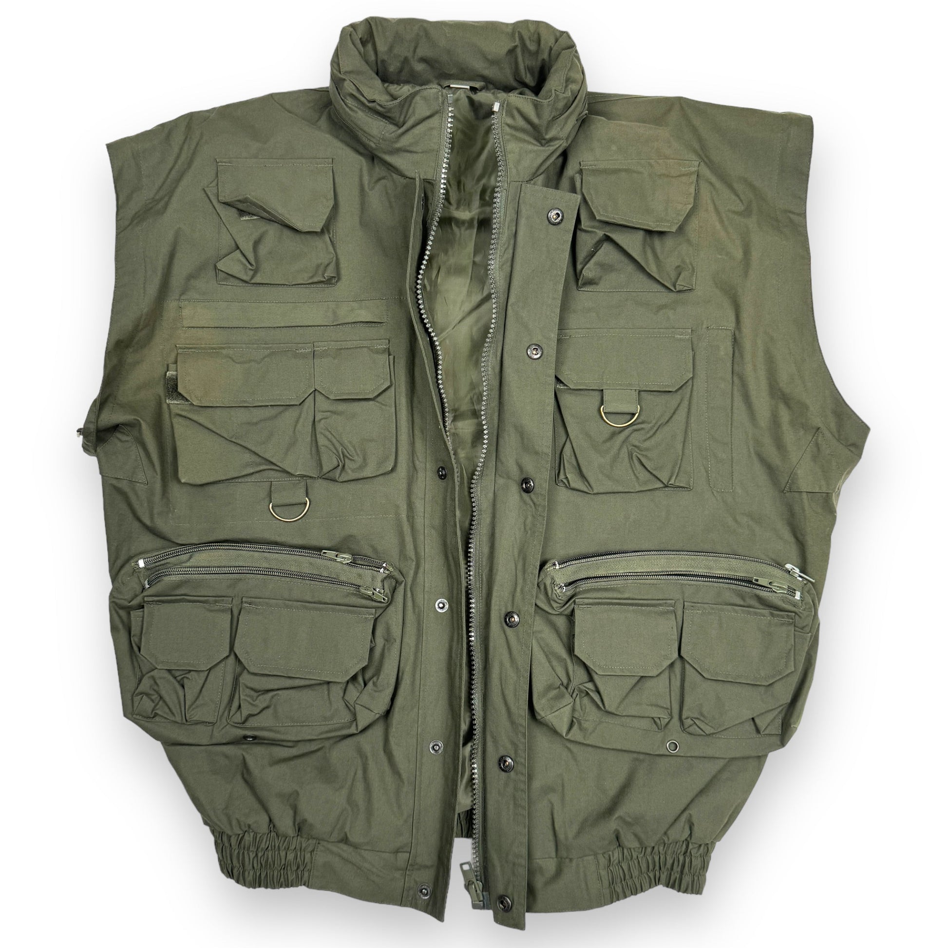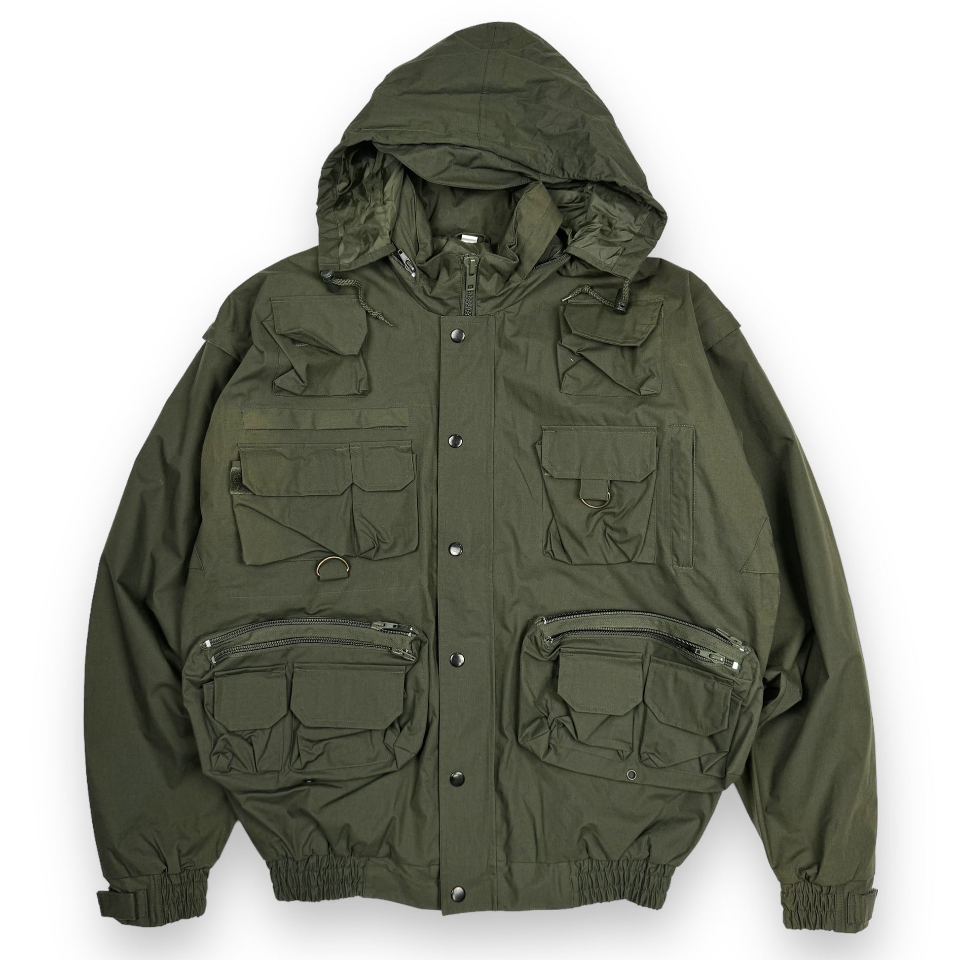 This piece is an excellent example of the functionality and utilitarian design approach to fishing garments during the 20th century. This piece is constructed from a durable waterproof fabric with nylon lining. It features a plethora of cargo pockets front and back, designed to carry absolutely anything and everything. The arms can be zipped off to convert this jacket into a vest, and the hood can be concealed in the collar.