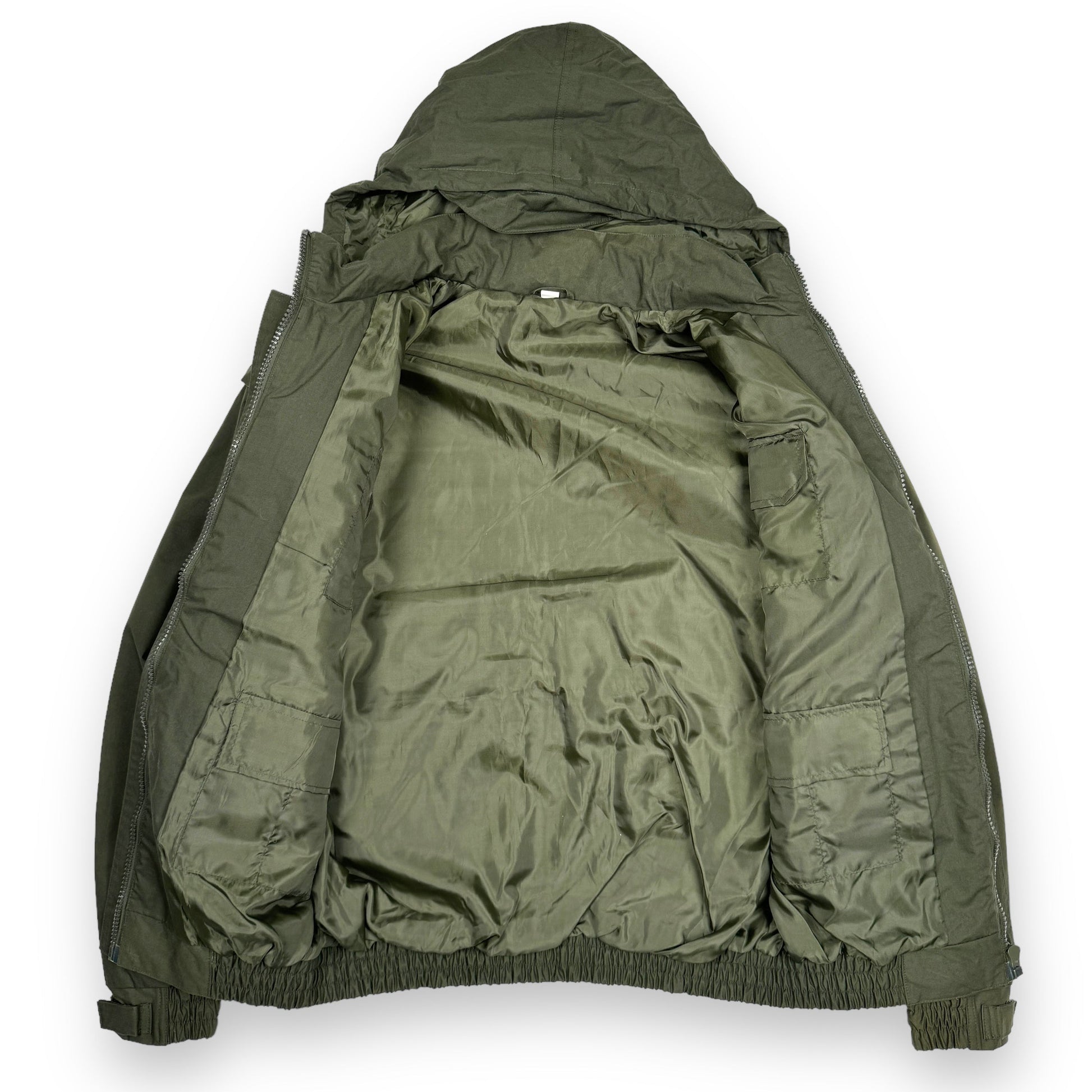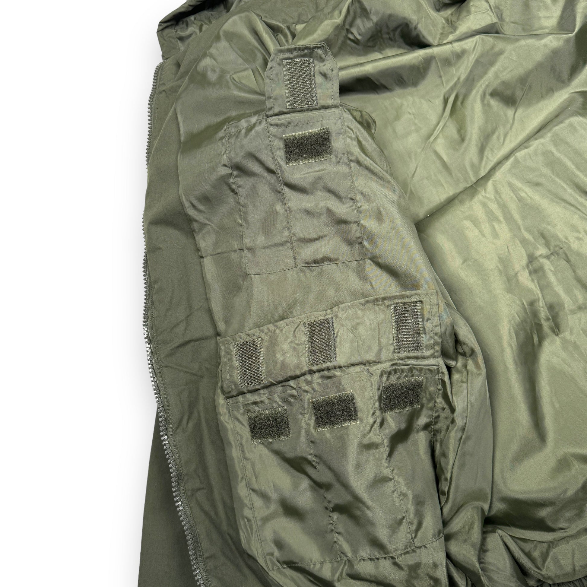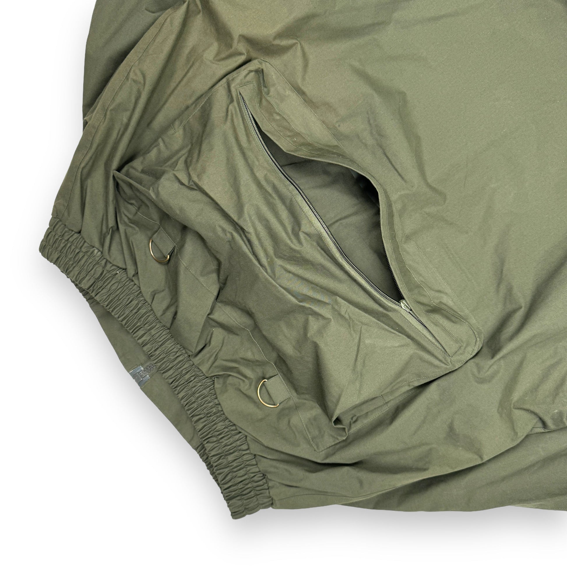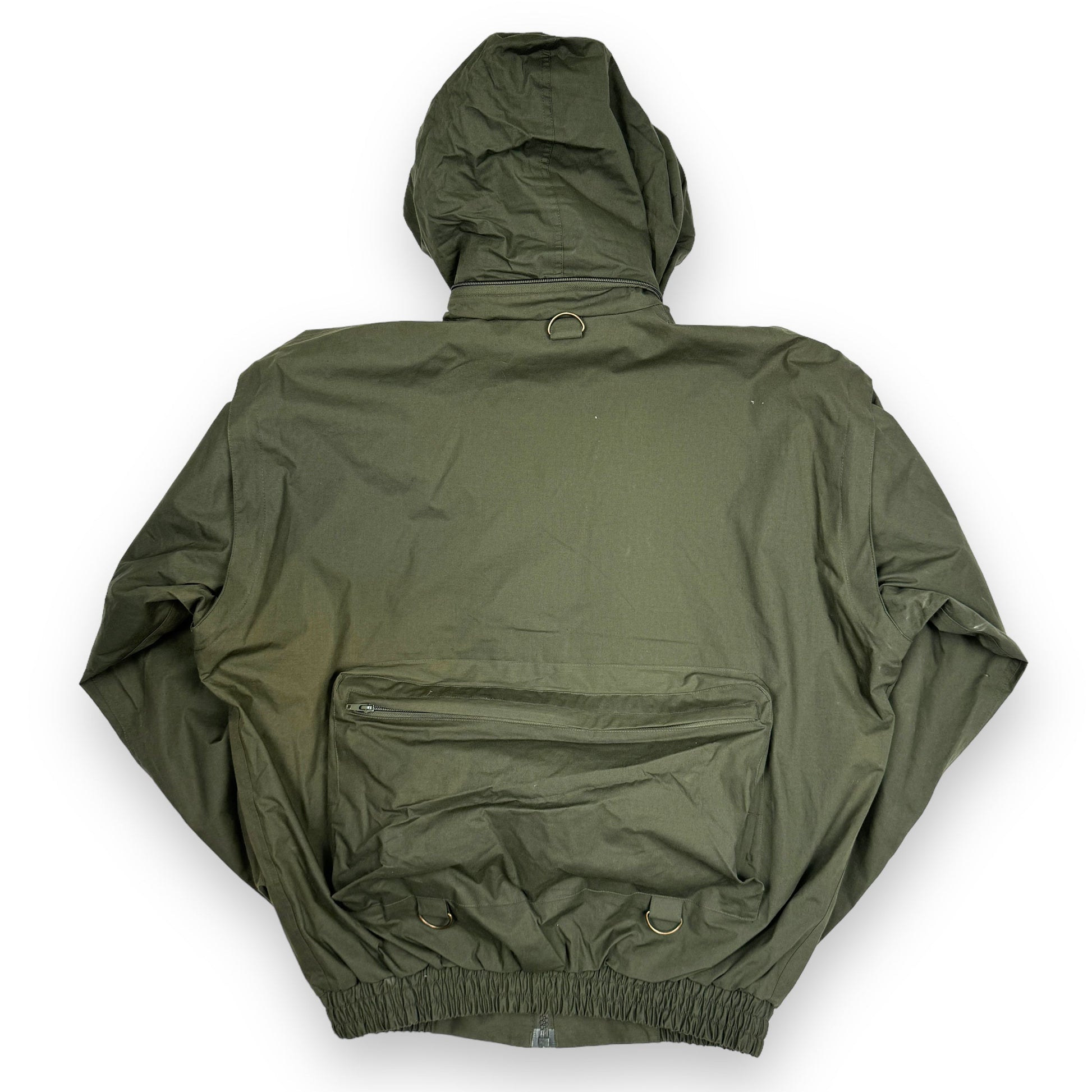 This piece is an excellent example of the functionality and utilitarian design approach to fishing garments during the 20th century. This piece is constructed from a durable waterproof fabric with nylon lining. It features a plethora of cargo pockets front and back, designed to carry absolutely anything and everything. The arms can be zipped off to convert this jacket into a vest, and the hood can be concealed in the collar.